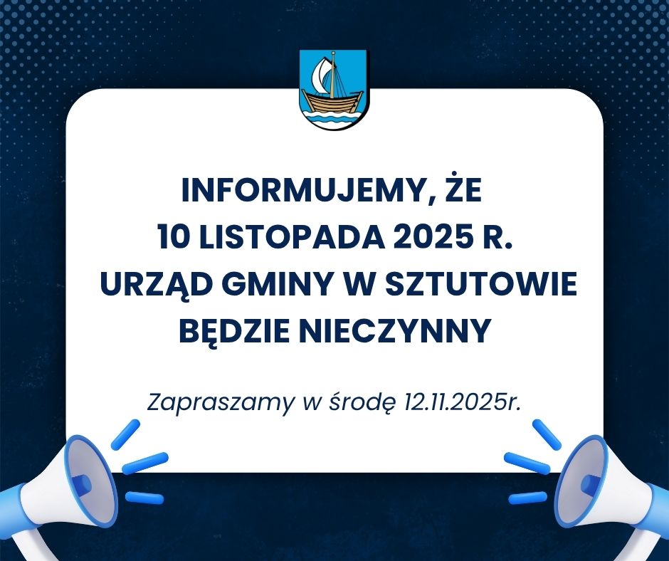 Strona główna » Aktualności » 10 listopada 2025- Urząd Gminy nieczynny Data dodania 22.10.2025 10 listopada 2025- Urząd Gminy nieczynny Wójt Gminy Sztutowo informuje, że dzień 10 listopada 2025 r. (poniedziałek) został ustalony dniem wolnym od pracy dla pracowników Urzędu Gminy, ze względu na święto Wszystkich Świętych przypadające w sobotę 1 listopada 2025 r. Drukuj