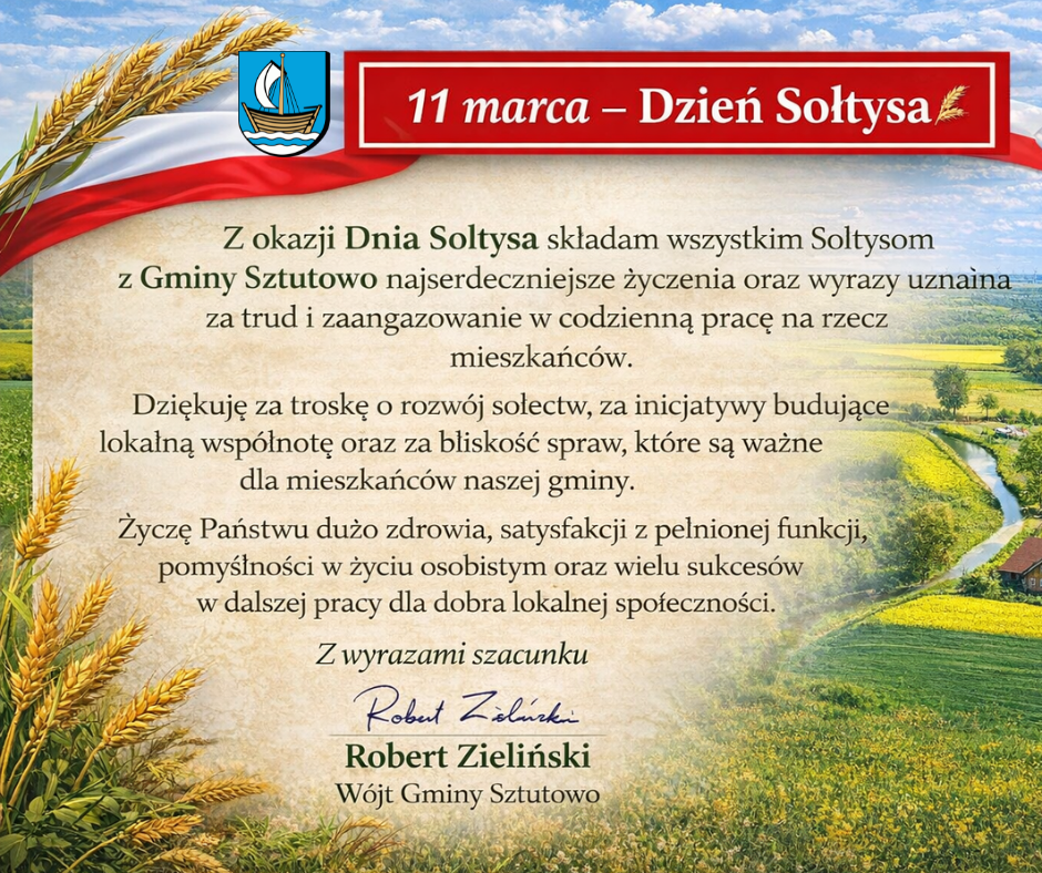 Z okazji Dnia Sołtysa składam wszystkim Sołtysom z Gminy Sztutowo najserdeczniejsze podziękowania i wyrazy uznania za codzienną pracę na rzecz lokalnych społeczności.