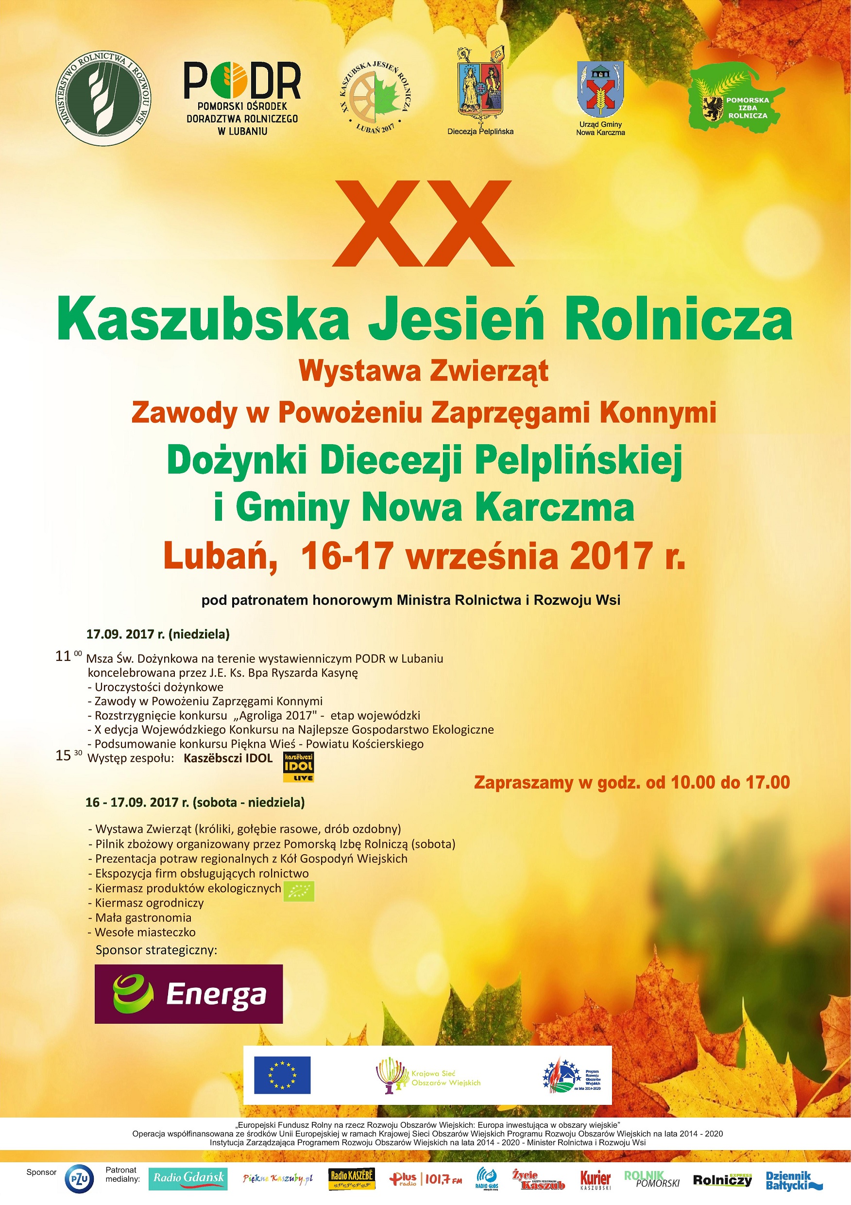 Pomorski Ośrodek Doradztwa Rolniczego w Lubaniu zaprasza na Diecezjalne Dożynki Diecezji Pelplińskiej oraz XX Kaszubską Jesień Rolniczą, które odbędą się w dniach 16-17 września 2017 roku w Lubaniu. Więcej informacji na stronie: