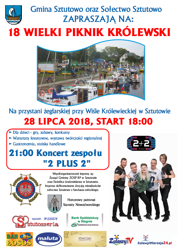 Zapraszamy na 18. wielki Piknik Królewski, który odbędzie się w najbliższą sobotę 28 lipca br. na przystani nad Wisłą Królewiecką w Sztutowie. Początek imprezy o godzinie 18:00. Tradycyjnie dla uczestników pikniku przewidziano „bigos komandora”.
