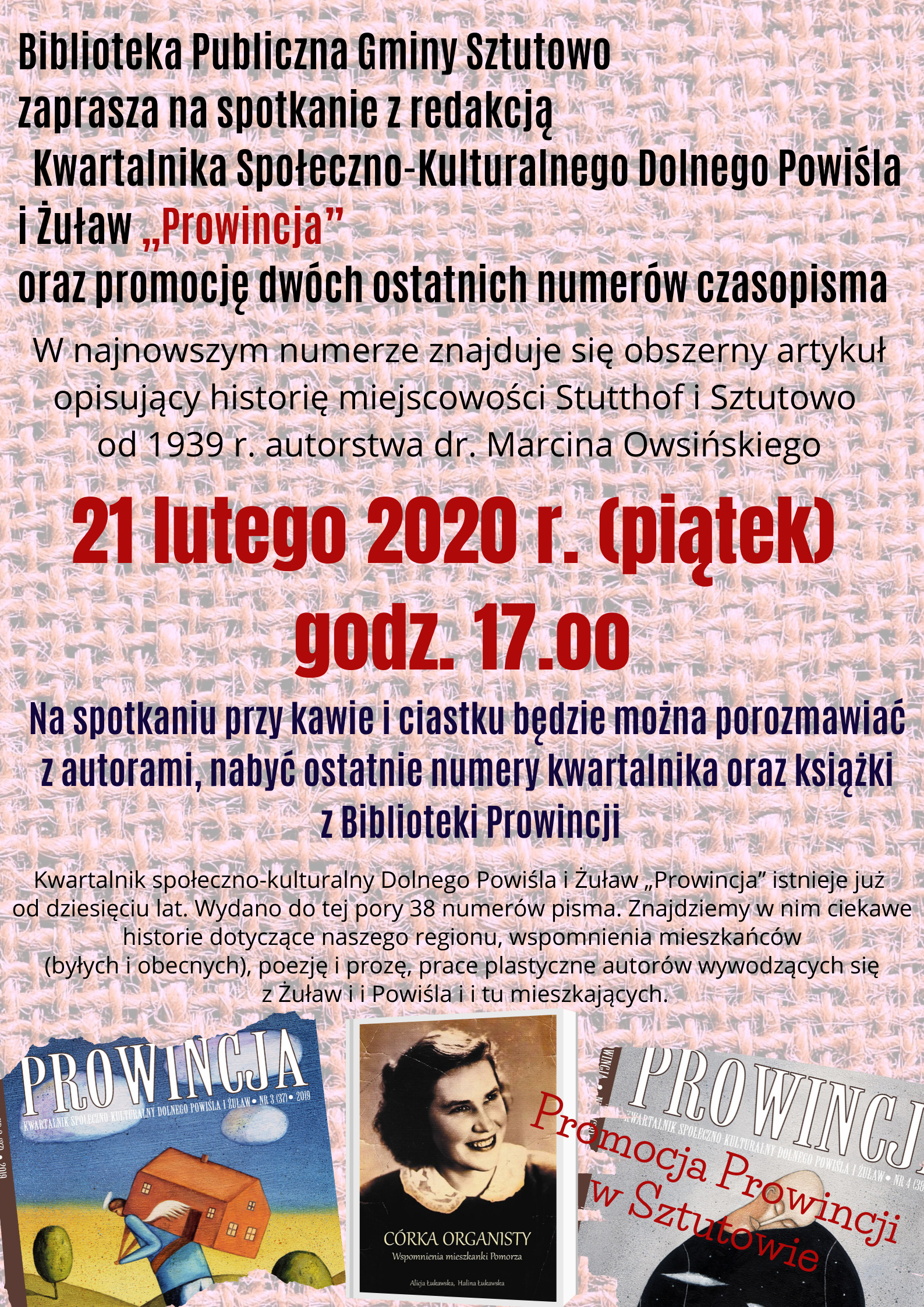 Kwartalnik społeczno-kulturalny Dolnego Powiśla i Żuław „Prowincja” istnieje już od dziesięciu lat. Od samego początku jego redaktorem naczelnym jest pochodzący ze Sztumu Leszek Sarnowski. Wydano do tej pory 38 numerów pisma. Znajdziemy w nim ciekawe historie dotyczące naszego regionu, wspomnienia mieszkańców (byłych i obecnych), poezję i prozę, prace plastyczne autorów wywodzących się z Żuław i Powiśla i tu mieszkających.