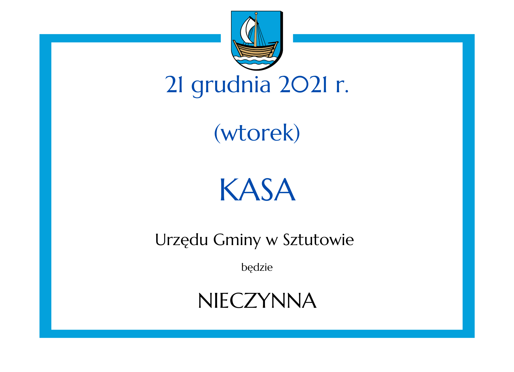 Strona główna » Aktualności » 21.12.2021 r. Kasa w Urzędzie Gminy nieczynna Data dodania 21.12.2021 21.12.2021 r. Kasa w Urzędzie Gminy nieczynna Drukuj