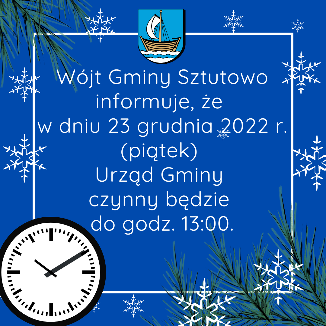Strona główna » Aktualności » 23 grudnia Urząd Gminy czynny krócej Data dodania 20.12.2022 23 grudnia Urząd Gminy czynny krócej Drukuj
