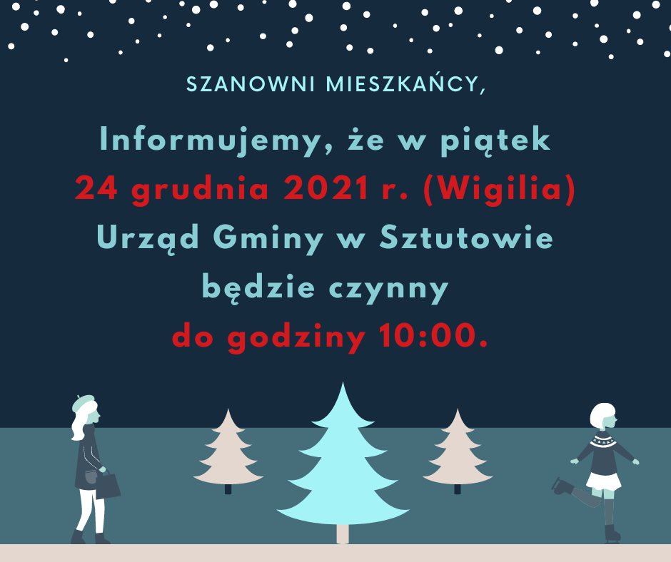 Strona główna » Aktualności » 24 GRUDNIA URZĄD CZYNNY DO 10:00 Data dodania 21.12.2021 24 GRUDNIA URZĄD CZYNNY DO 10:00 Szanowni Mieszkańcy, Uprzejmie informujemy, że w piątek 24 grudnia 2021 r. (Wigilia) Urząd Gminy w Sztutowie będzie czynny do godziny 10:00. Drukuj