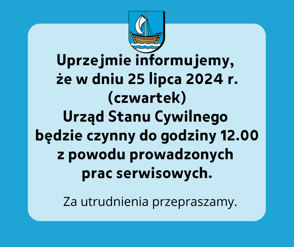 Strona główna » Aktualności » 25.07.2024- USC czynny do godz. 12:00 Data dodania 24.07.2024 25.07.2024- USC czynny do godz. 12:00 Uprzejmie informujemy, że w dniu 25 lipca 2024 r. (czwartek) Urząd Stanu Cywilnego będzie czynny do godziny 12.00 z powodu prowadzonych prac serwisowych. Za utrudnienia przepraszamy. Drukuj