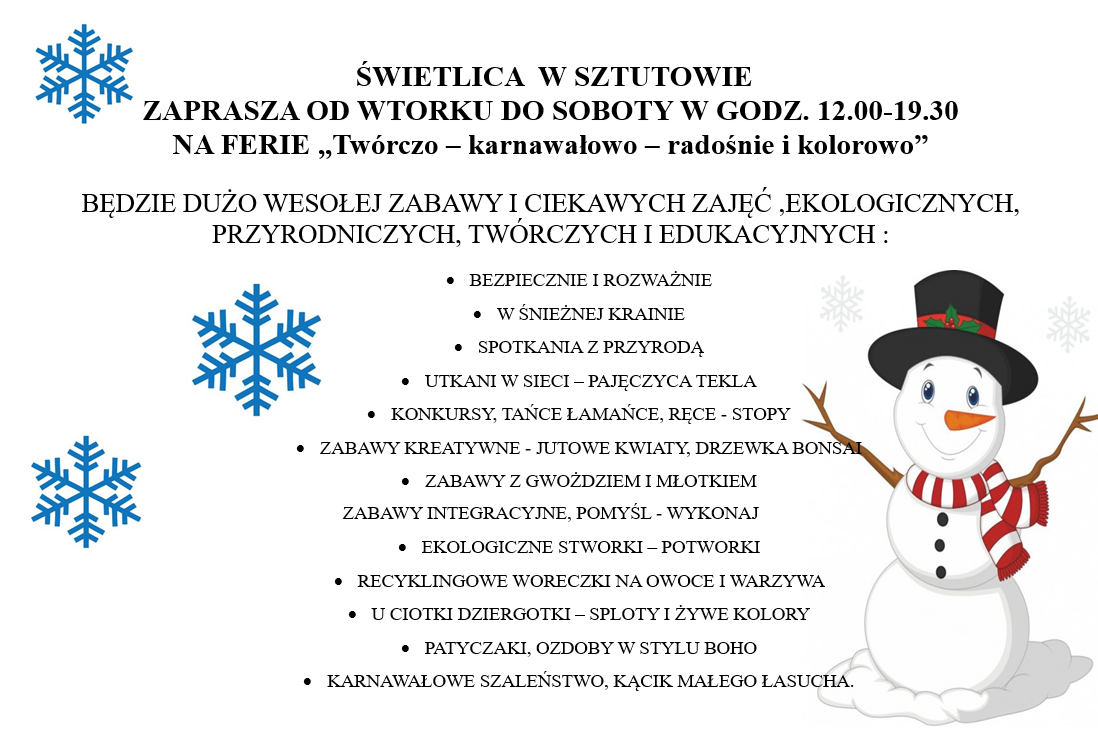ŚWIETLICA W SZTUTOWIE ZAPRASZA OD WTORKU DO SOBOTY W GODZ. 12.00-19.30 NA FERIE „Twórczo – karnawałowo – radośnie i kolorowo”
