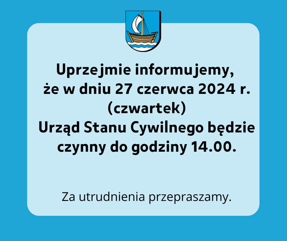 Strona główna » Aktualności » 27.06.2024- USC czynny do godz. 14:00 Data dodania 26.06.2024 27.06.2024- USC czynny do godz. 14:00 Drukuj