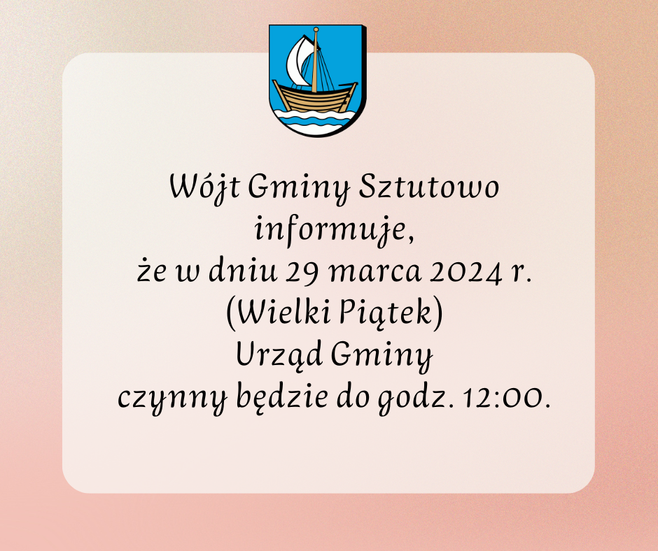 Strona główna » Aktualności » 29.03.2024r. UG czynny do 12:00 Data dodania 28.03.2024 29.03.2024r. UG czynny do 12:00 Szanowni Mieszkańcy,informujemy, iż 29 marca 2024 r. (Wielki Piątek) Urząd Gminy w Sztutowie będzie czynny do godziny 12:00. Wójt Gminy Sztutowo pełni dyżur od godz. 12:00 do 15:30. Drukuj