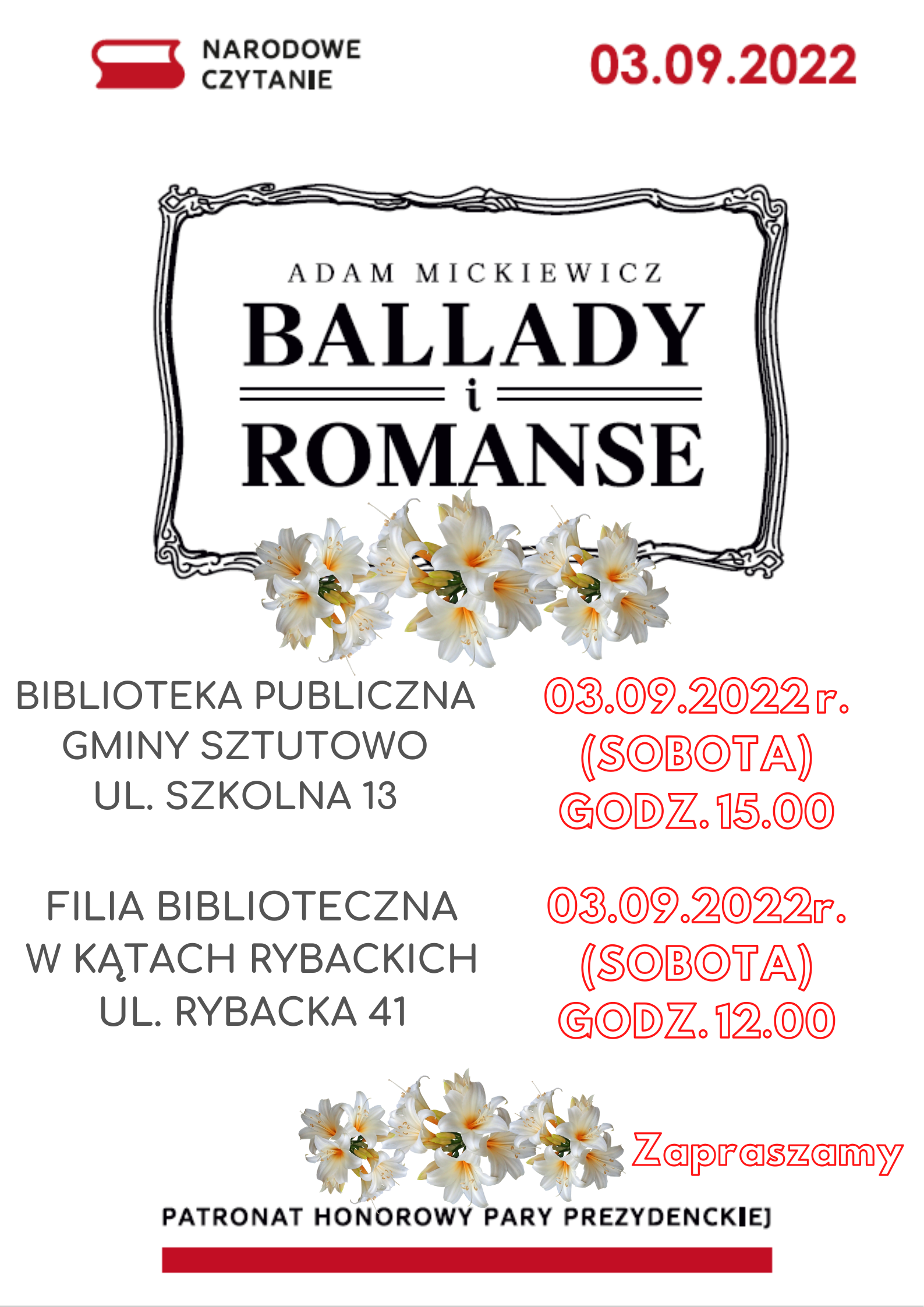 Strona główna » Aktualności » 3.09 – Narodowe Czytanie 2022 Data dodania 30.08.2022 3.09 – Narodowe Czytanie 2022 3 września 2022 zapraszamy na Narodowe Czytanie do naszych bibliotek. W tym roku „Ballady i Romanse” Adama Mickiewicza. Drukuj