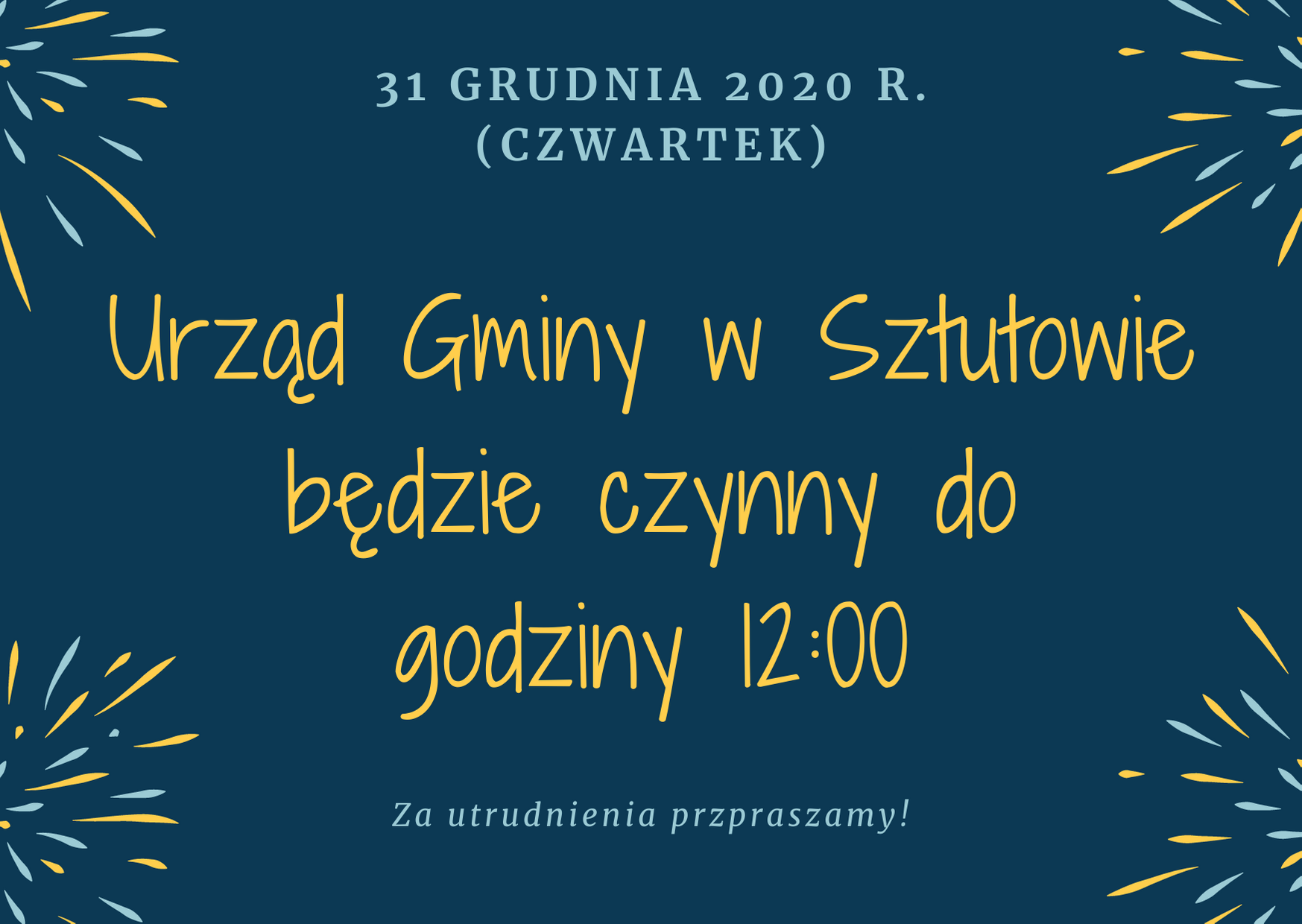 Strona główna » Aktualności » 31.12.2020 r. Urząd czynny do 12:00 Data dodania 29.12.2020 31.12.2020 r. Urząd czynny do 12:00 Informujemy, że 31 grudnia 2020 r. (czwartek) Urząd Gminy w Sztutowie będzie czynny do godziny 12:00. Za utrudnienia przepraszamy! Drukuj