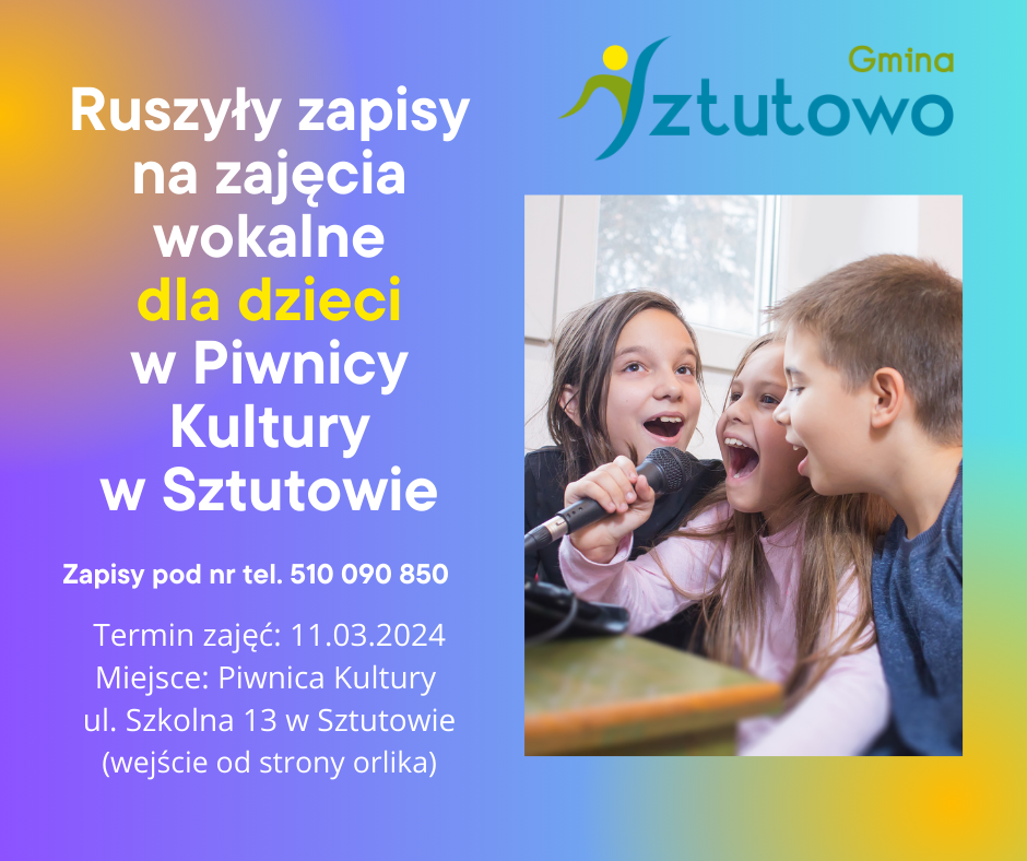 Strona główna » Aktualności » Data dodania 08.03.2024 Już od 11 marca o g. 16:45, w Piwnicy Kultury w Sztutowie przy ul. Szkolnej 13 ruszają zajęcia wokalne dla dzieci. Zapraszamy wszystkich chętnych. Zapisy i więcej informacji pod nr tel. 510 090 850. Drukuj