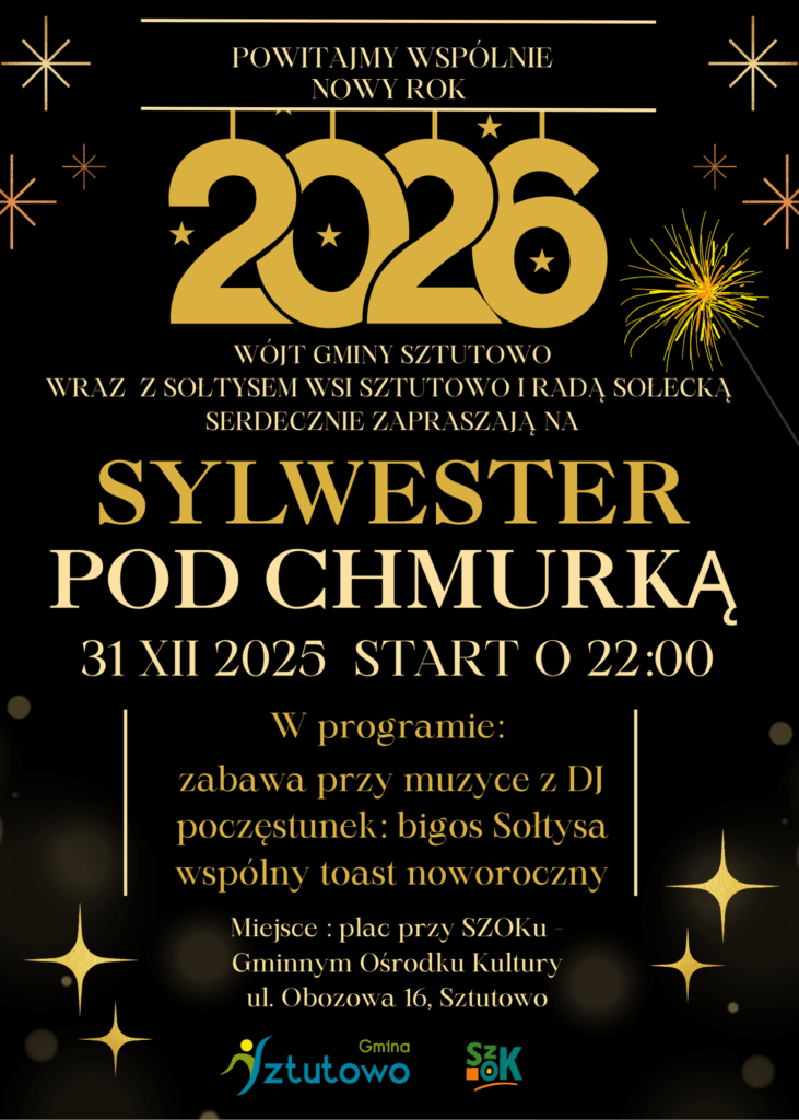 w imieniu Wójta Gminy Sztutowo oraz Sołtysa wsi Sztutowo serdecznie zapraszamy Państwa na wspólne powitanie Nowego Roku, które odbędzie się przy Gminnym Ośrodku Kultury w Sztutowie.