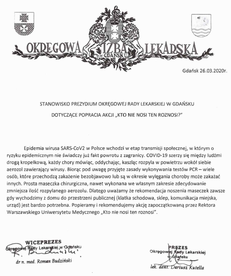 Okręgowa Izba Lekarska w Gdańsku rekomenduje powszechne noszenie maseczek w przestrzeni publicznej. My również zachęcamy i polecamy. Zostańmy w domach, ale zakładajmy maseczki, kiedy musimy wyjść!