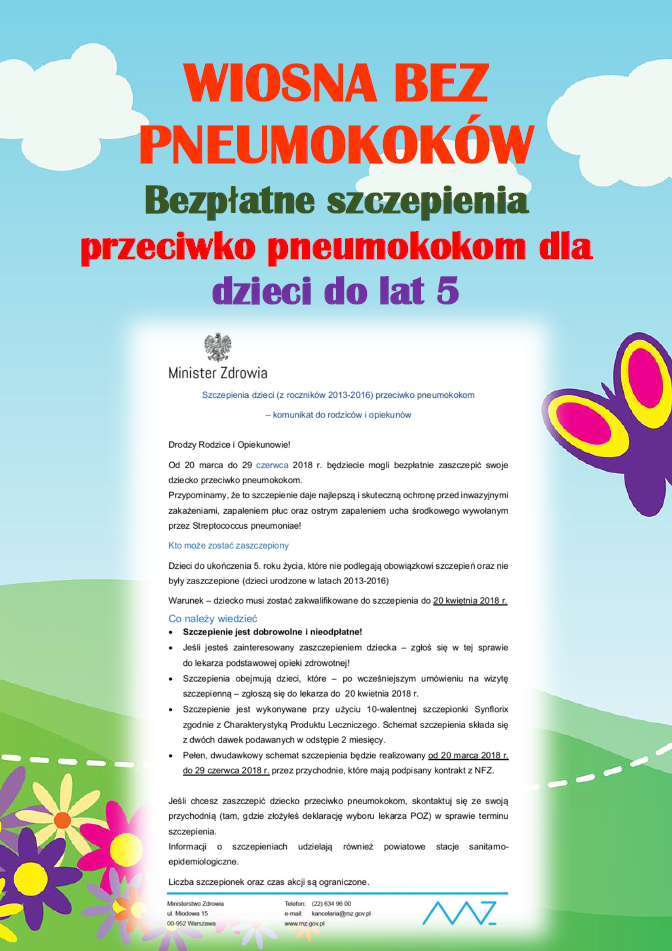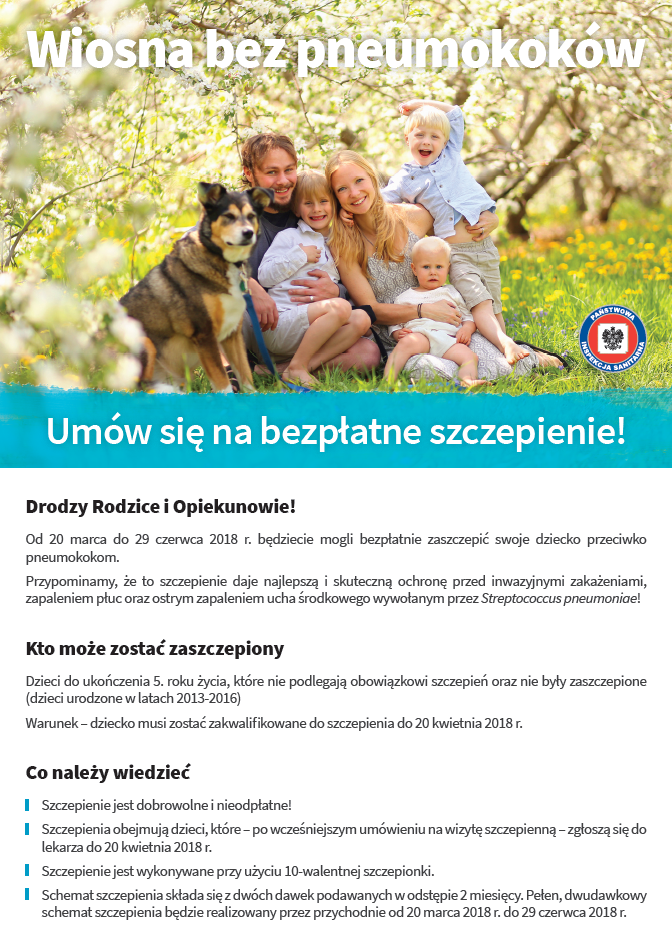 Ministerstwo Zdrowia zachęca do wzięcia udziału w akcji „Wiosna bez pneumokoków”. Można zaszczepić dzieci do 5 roku życia (dzieci urodzone w latach 2013-2016), które dotąd nie otrzymały szczepionki przeciw pneumokokom. Wystarczy tylko zgłosić się do swojego Lekarza Pierwszego Kontaktu. Szczepienia obejmą dzieci, które po wcześniejszym umówieniu na wizytę szczepienną, zgłoszą się do lekarza do 20 kwietnia 2018 roku.