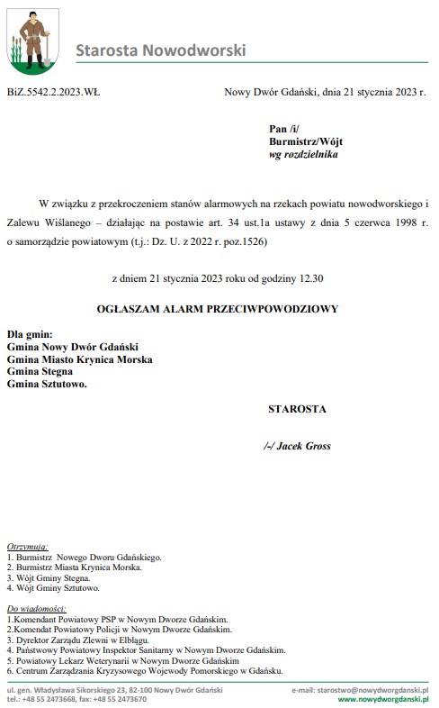 Informuję, że w związku z przekroczeniem stanów alarmowych na rzece Szkarpawa i Zalewie Wiślanym, Starosta Nowodworski z dniem 21 stycznia 2023 roku od godziny 12.30 ogłosił Alarm Przeciwpowodziowy dla gmin: Nowy Dwór Gdański, Krynica Morska, Stegna i Sztutowo.