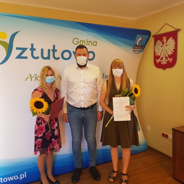 27 sierpnia br. w Urzędzie Gminy w Sztutowie Wójt Robert Zieliński wręczył akty nadania stopnia awansu zawodowego pani Ewelinie Podolskiej oraz pani Magdalenie Urbańskiej – nauczycielkom ze Szkoły Podstawowej w Sztutowie. Obie panie uzyskały stopień nauczyciela mianowanego. Gratulujemy i życzymy samych sukcesów!