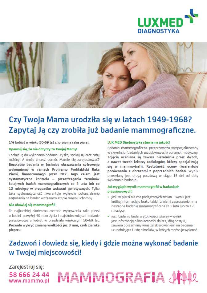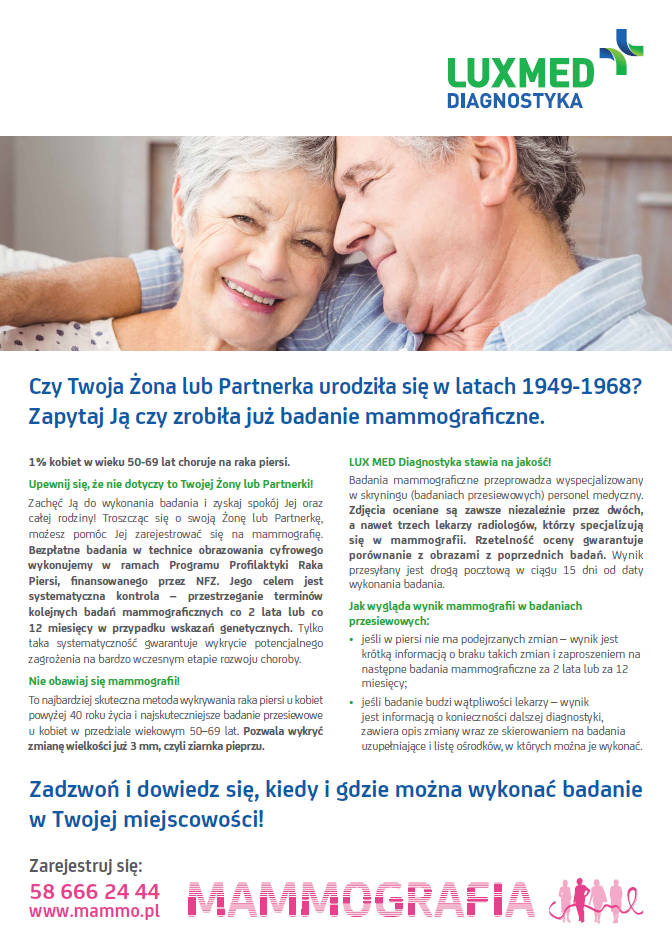 Grupa Lux Med zaprasza na bezpłatne badania mammograficzne dla kobiet w wieku 50-69 lat. Badania odbędą się 21 czerwca 2018 r. w Mammobusie na parkingu przy Urzędzie Gminy w Sztutowie. Szczegóły na plakatach.