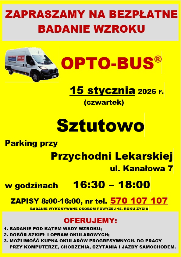 Strona główna » Aktualności » Bezpłatne badanie wzroku Data dodania 16.12.2025 Bezpłatne badanie wzroku Miejsce: Sztutowo, ul. Kanałowa 7 ( przy przychodni lekarskiej) Termin: 15.01.2025, godz. 16:30-18:00 Drukuj