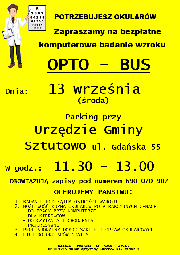 W imieniu firmy TOP-OPTYKA serdecznie zapraszamy do skorzystania z bezpłatnych komputerowych badań wzroku dla mieszkańców Gminy Sztutowo w dniu 13 września (środa) w godzinach 11.30-13.00 na parkingu przy Urzędzie Gminy.
