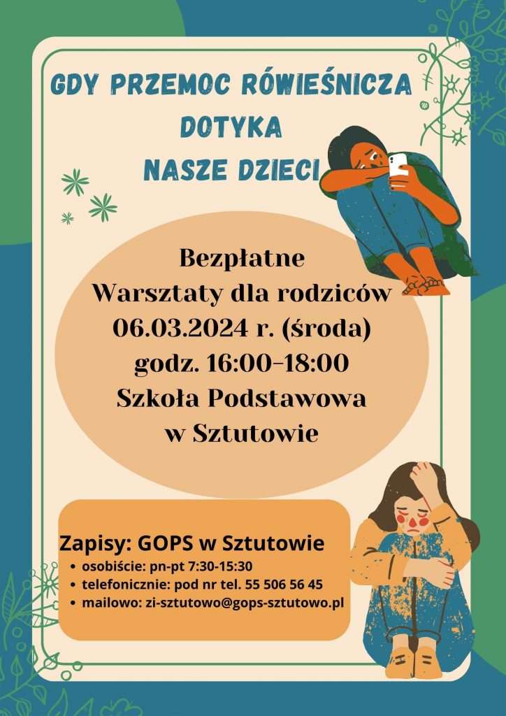Zespół Interdyscyplinarny w Sztutowie oraz Szkoła Podstawowa w Sztutowie zapraszają zainteresowanych rodziców na bezpłatne warsztaty pt. „Gdy przemoc rówieśnicza dotyka nasze dzieci” – praktyczne narzędzia i strategie.