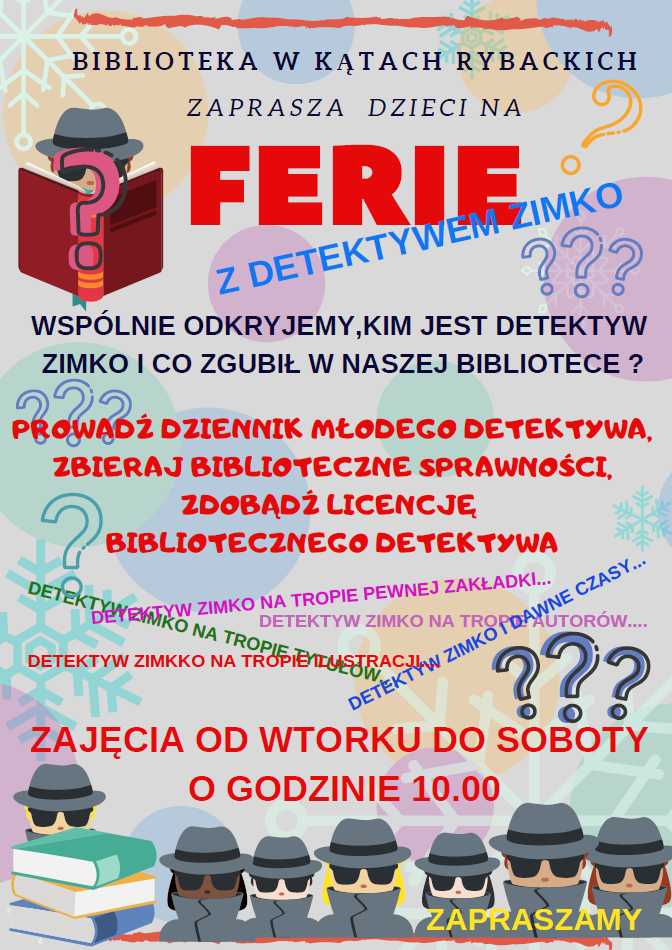 Strona główna » Aktualności » Biblioteka w Kątach Rybackich zaprasza na Ferie z Detektywem Zimko Data dodania 06.02.2019 Biblioteka w Kątach Rybackich zaprasza na Ferie z Detektywem Zimko Drukuj