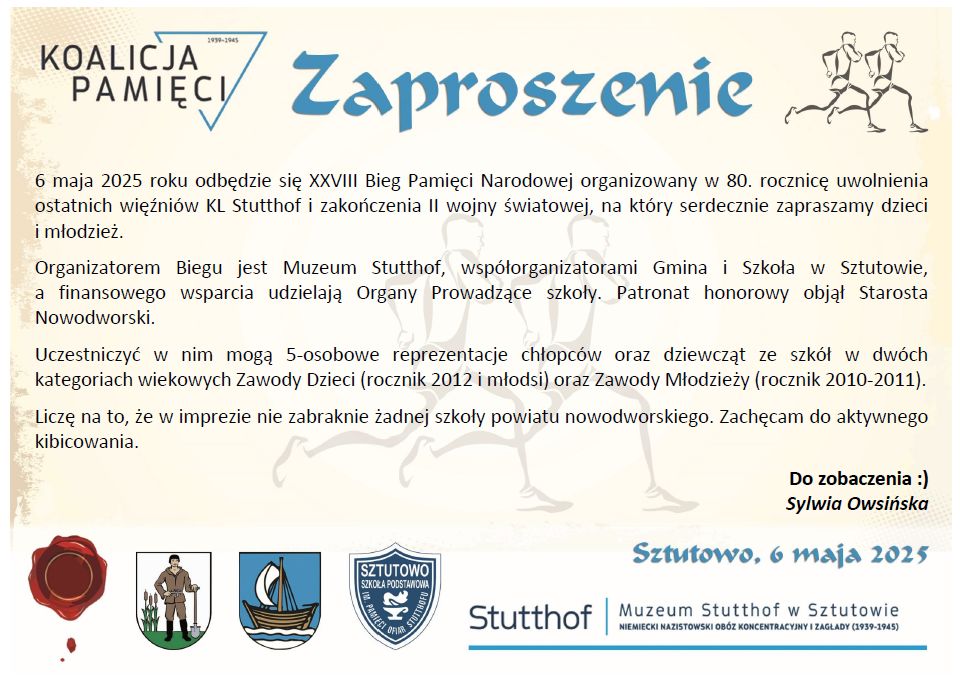 w związku z organizacją w dniu 6 maja 2025 roku XXVIII Biegu Pamięci Narodowej organizowanego w 80. rocznicę uwolnienia ostatnich więźniów KL Stutthof i zakończenia II wojny światowej informujemy ,iż w godzinach 8:30 – 12:30 zostaną wyłączone z użytku ruchu drogowego częściowo następujące ulice: Szkolna, Obozowa, Sportowa.