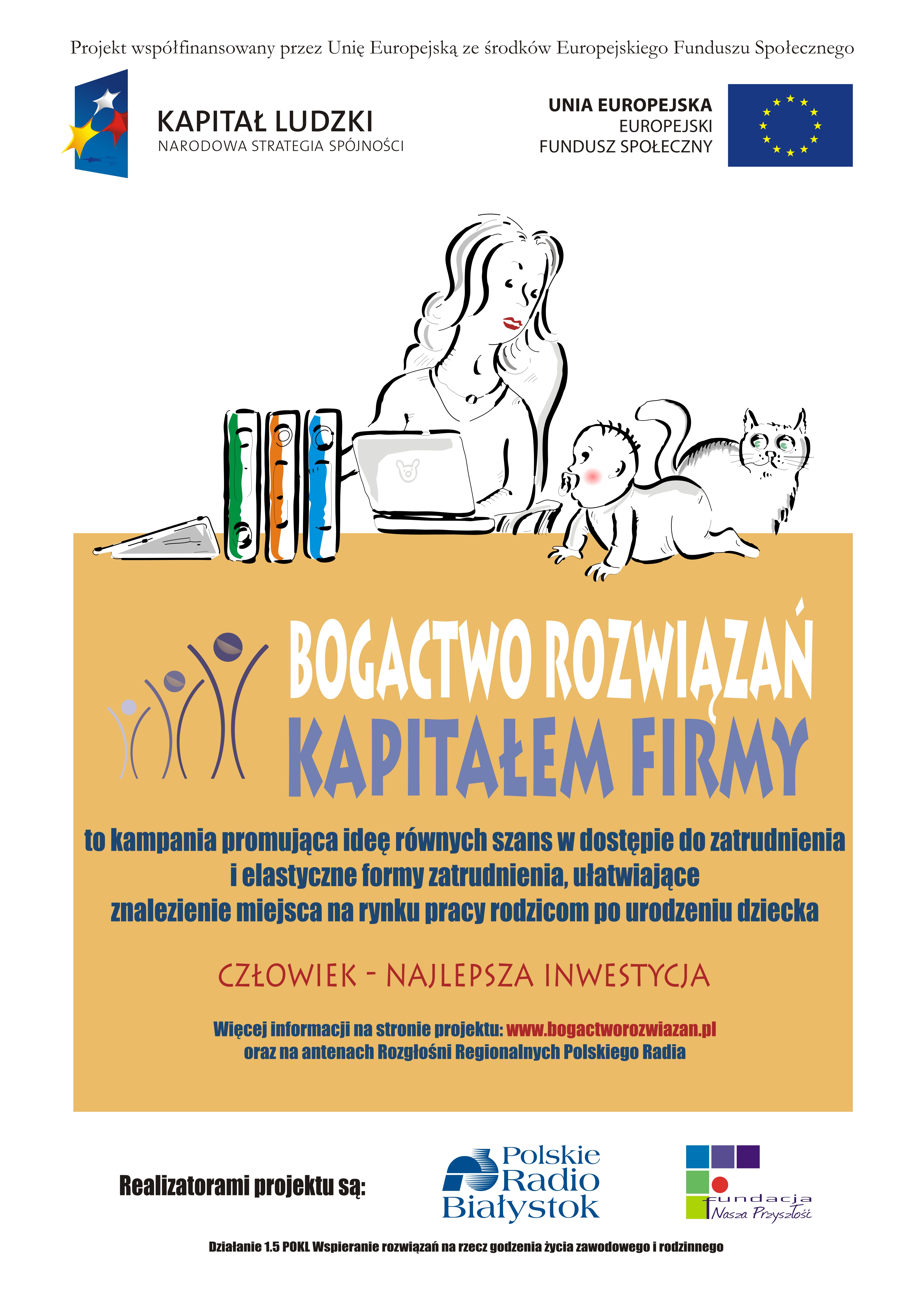 Ogólnopolski projekt „Bogactwo rozwiązań – kapitałem firmy” realizowany jest od 1 listopada 2012 r. do 31 października 2013 r. w ramach Programu Operacyjnego Kapitał Ludzki, Priorytet I Zatrudnienie i integracja społeczna, Działanie 1.5 Wspieranie rozwiązań na rzecz godzenia życia zawodowego i rodzinnego.