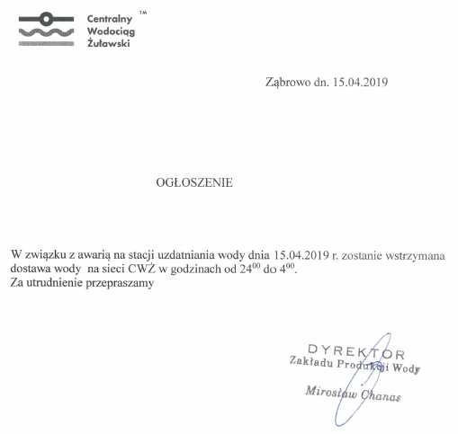 Strona główna » Aktualności » Brak w dostawie wody 15/16.04.2019 r. w godzinach 24:00 – 4:00 Data dodania 15.04.2019 Brak w dostawie wody 15/16.04.2019 r. w godzinach 24:00 – 4:00 Drukuj