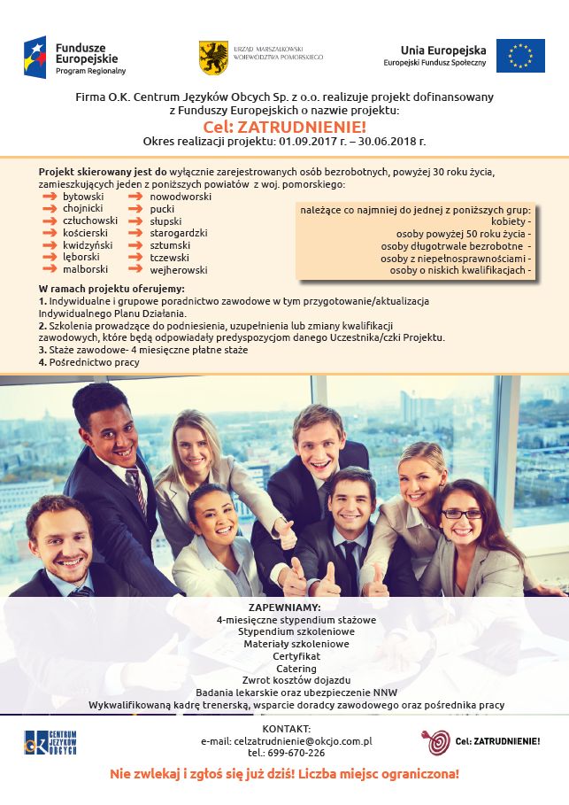 Firma O.K. Centrum Języków Obcych Sp. z o.o. realizuje projekt dofinansowany z Funduszy Europejskich o nazwie projektu: Cel: ZATRUDNIENIE!
