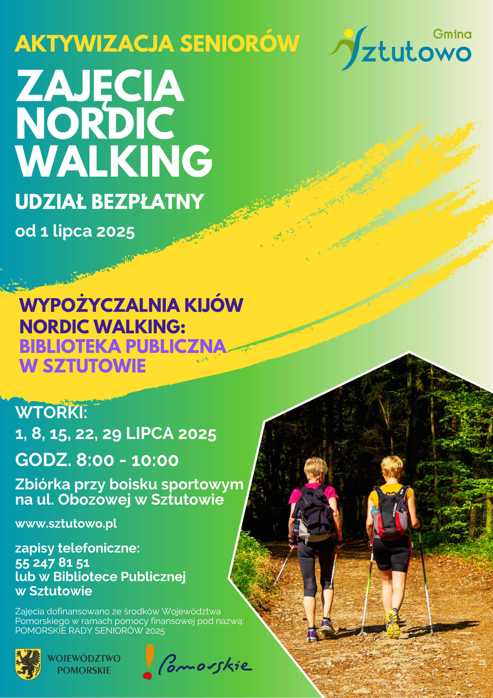 Pierwsze działanie rozpoczynamy 1 lipca 2025 – zajęcia nordic walking w plenerze – seria 10 godzin zajęć i spacerów ze specjalistą, dzięki któremu uczestnicy będą doskonalić umiejętność efektywnych i bezpiecznych spacerów nordic walking. Zajęcia odbywać się będą we wtorki w godzinach 8:00- 10:00. Zbiórka o godz. 8:00 na boisku sportowym przy ul. Obozowej w Sztutowie.
