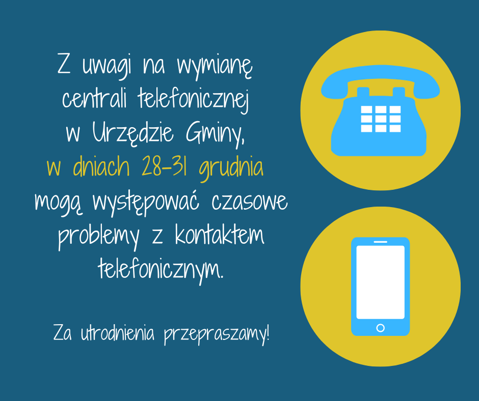 Strona główna » Aktualności » Czasowe problemy z kontaktem telefonicznym Data dodania 18.12.2020 Czasowe problemy z kontaktem telefonicznym Szanowni Mieszkańcy, Z uwagi na wymianę centrali telefonicznej w Urzędzie Gminy, w dniach 28-31 grudnia mogą występować czasowe problemy z kontaktem telefonicznym. Za utrudnienia przepraszamy! Drukuj