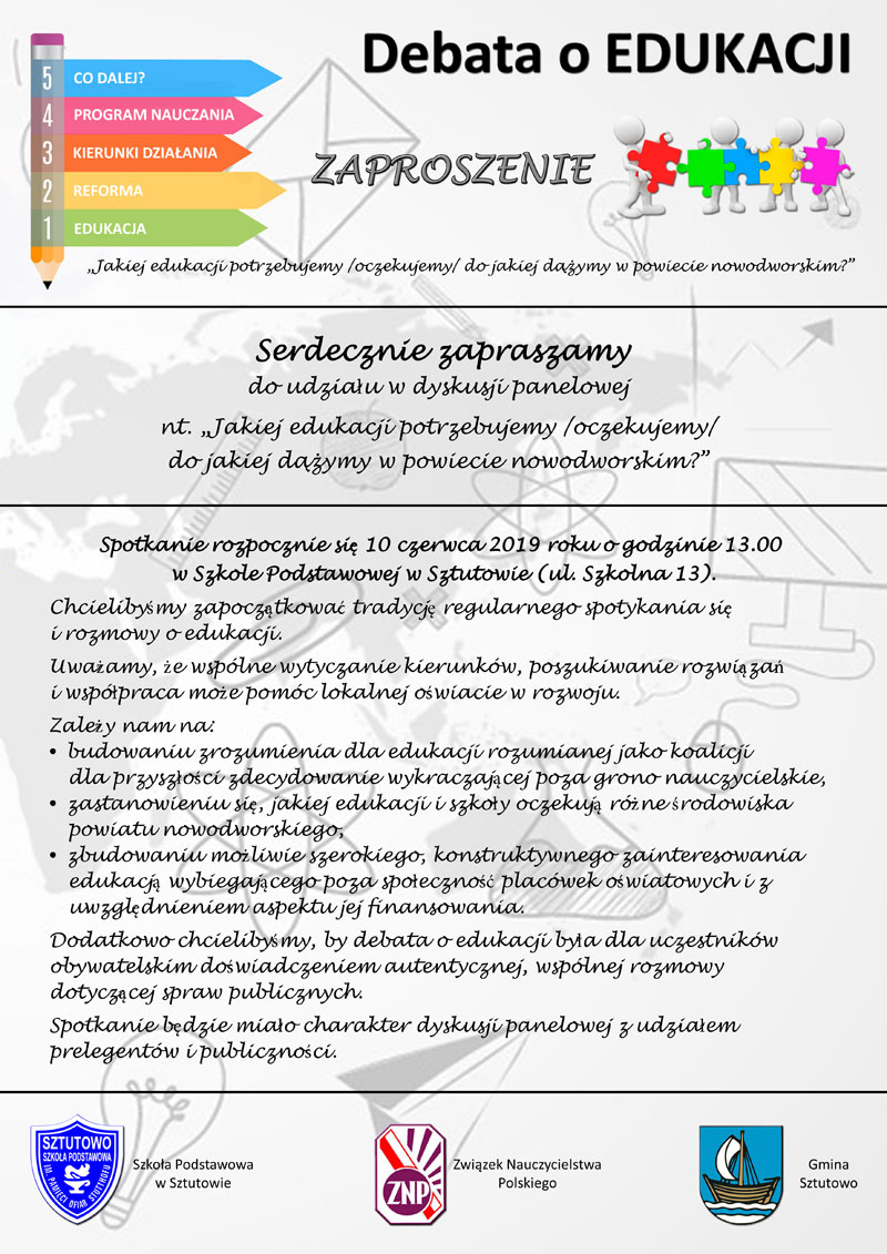 Serdecznie zapraszamy do udziału w dyskusji nt. „Jakiej edukacji potrzebujemy/ oczekujemy/ do jakiej dążymy w powiecie nowodworskim?”. Spotkanie będzie miało charakter dyskusji panelowej z udziałem prelegentów i publiczności. Serdecznie zapraszamy rodziców, młodzież, przedstawicieli władz oraz instytucji bezpośrednio lub pośrednio zainteresowanych oświatą.