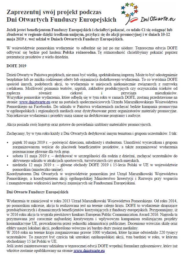Strona główna » Aktualności » Dni Otwarte Funduszy Europejskich 10-12 maja 2019 r. Data dodania 14.03.2019 Dni Otwarte Funduszy Europejskich 10-12 maja 2019 r. Drukuj