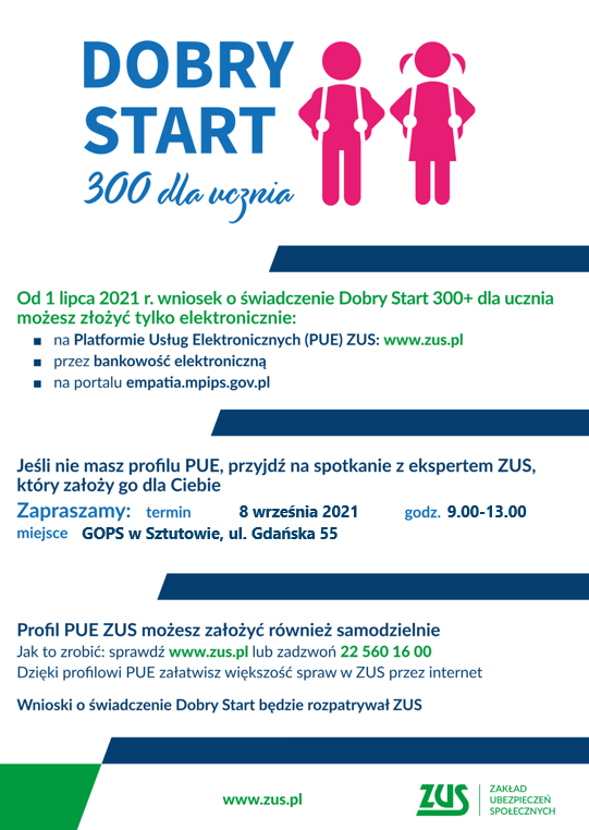 Zapraszamy 8 września 2021 r. w godzinach 9:00 – 13:00 do GOPS w Sztutowie, ul. Gdańska 55.