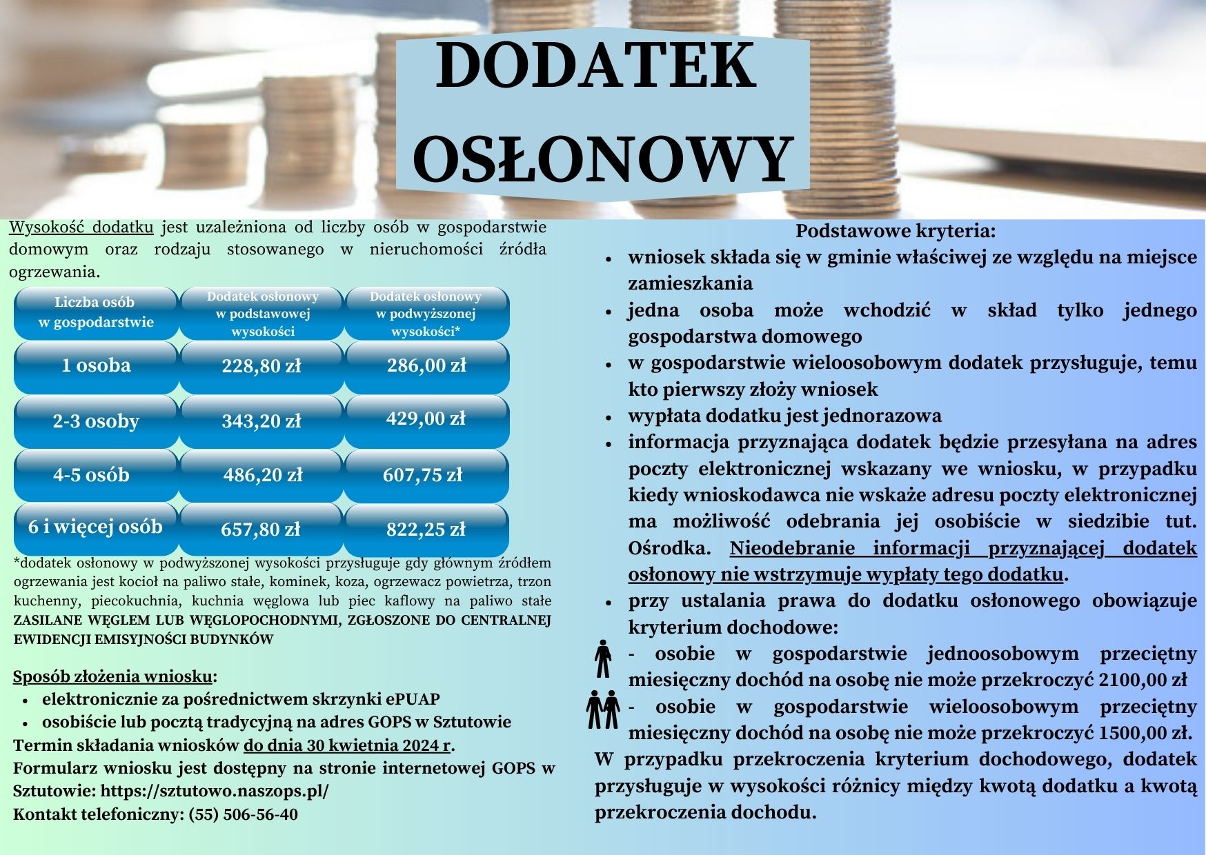 Strona główna » Aktualności » Dodatek osłonowy 2024 Data dodania 25.01.2024 Dodatek osłonowy 2024 Wniosek pod linkiem: https://sztutowo.naszops.pl/dokumenty-do-pobrania/wzor-wniosku-o-wyplate-dodatku-oslonowego Drukuj