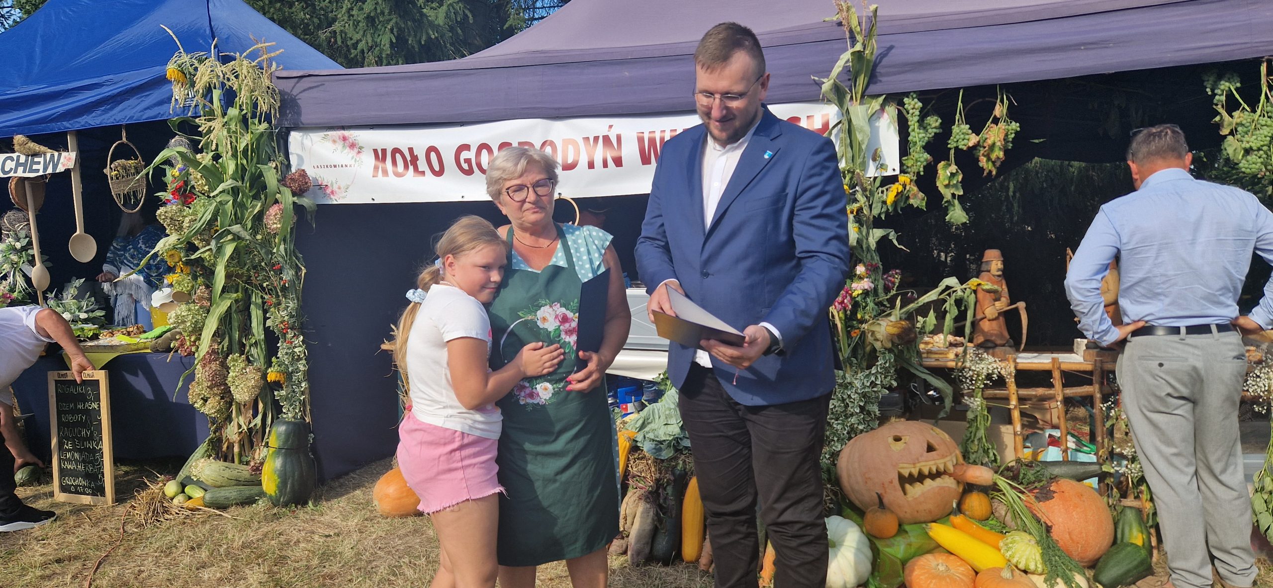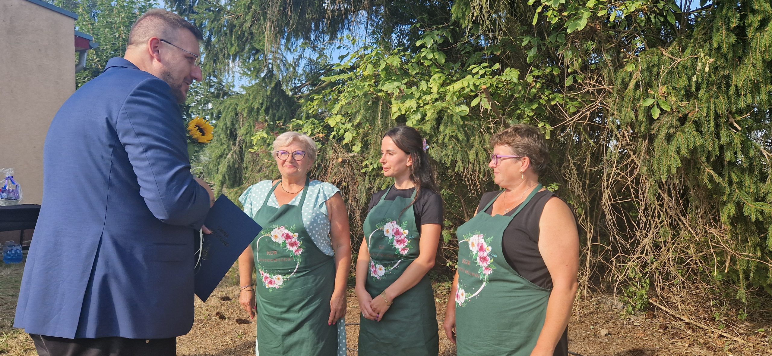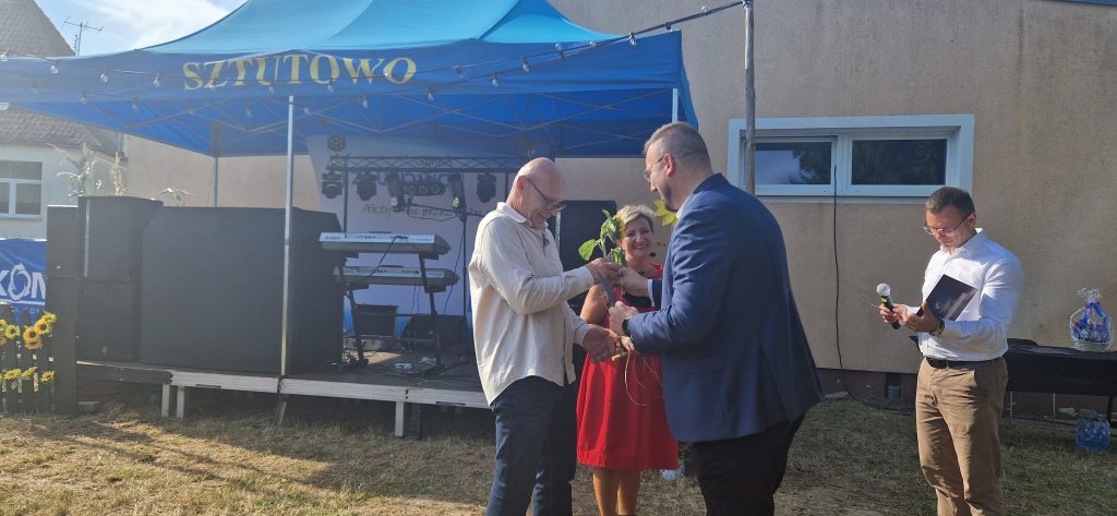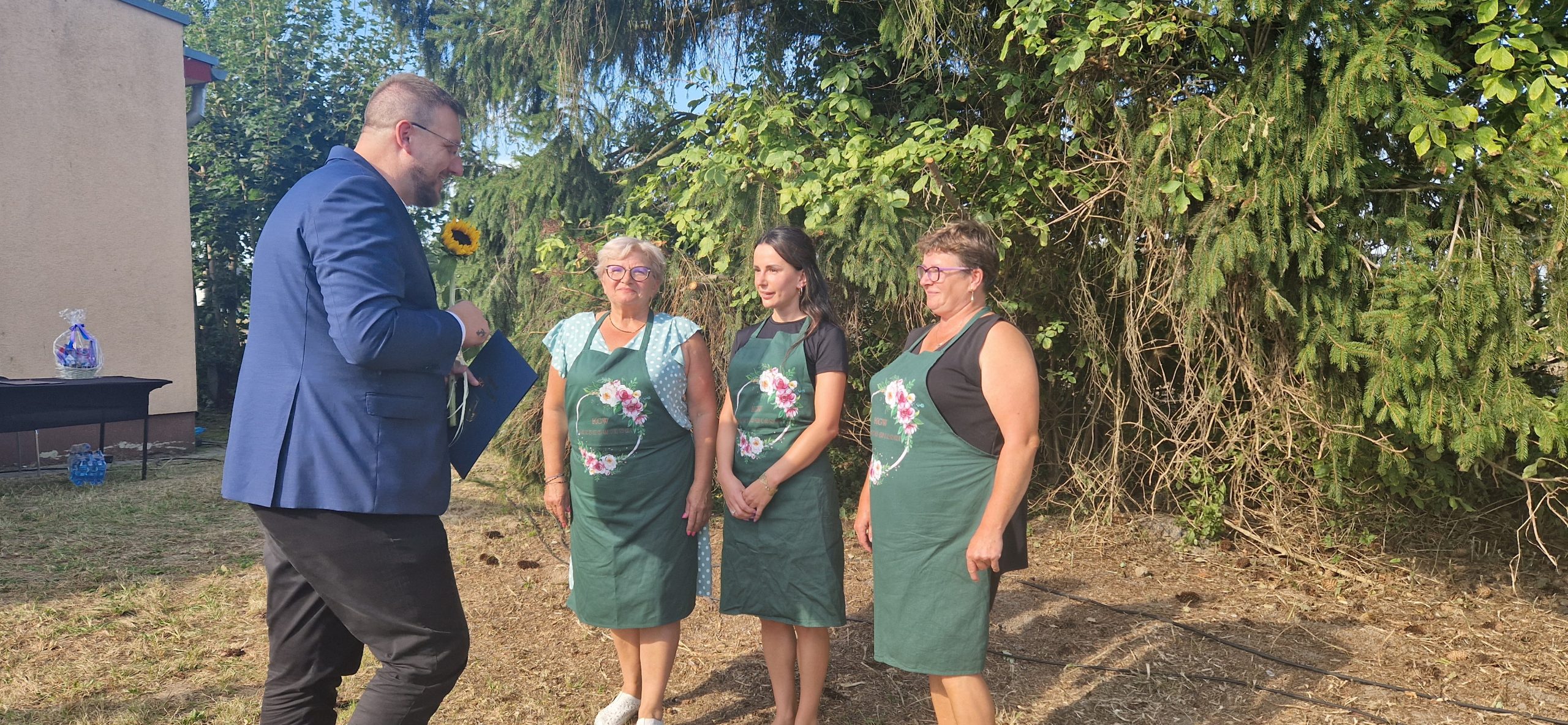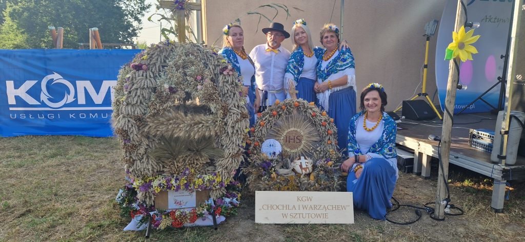 Następnie nadszedł czas na podziękowania za zaangażowanie i przygotowanie wieńców dożynkowych, tu wielkie brawa należą się KGW Łaszkowianki z Łaszki i KGW Chochla i Warząchew ze Sztutowa oraz ich przyjaciołom, którzy wspólnie stworzyli przepiękne i niewątpliwie czasochłonne dzieła sztuki.