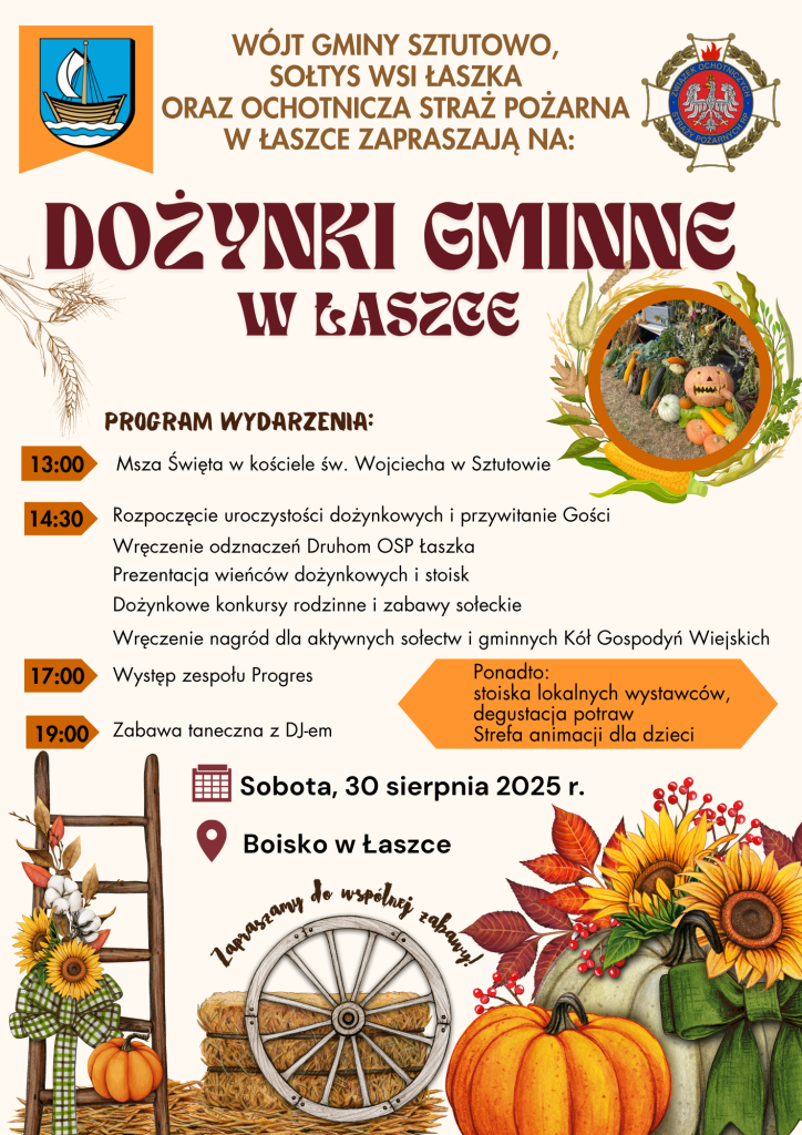 W imieniu Wójta Gminy Sztutowo, Sołtysa wsi Łaszka oraz Ochotniczej Straży Pożarnej w Łaszce serdecznie zapraszamy Mieszkańców i Gości na Dożynki Gminne 2025, które w tym roku mają wyjątkowy charakter – będą połączone z obchodami jubileuszu 80-lecia OSP w Łaszce!