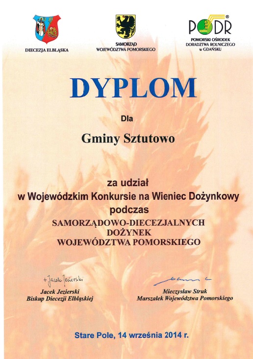 Strona główna » Aktualności » Dyplom dla Gminy Sztutowo za udział w Wojewódzkim Konkursie na Wieniec Dożynkowy Data dodania 15.09.2014 Dyplom dla Gminy Sztutowo za udział w Wojewódzkim Konkursie na Wieniec Dożynkowy Drukuj