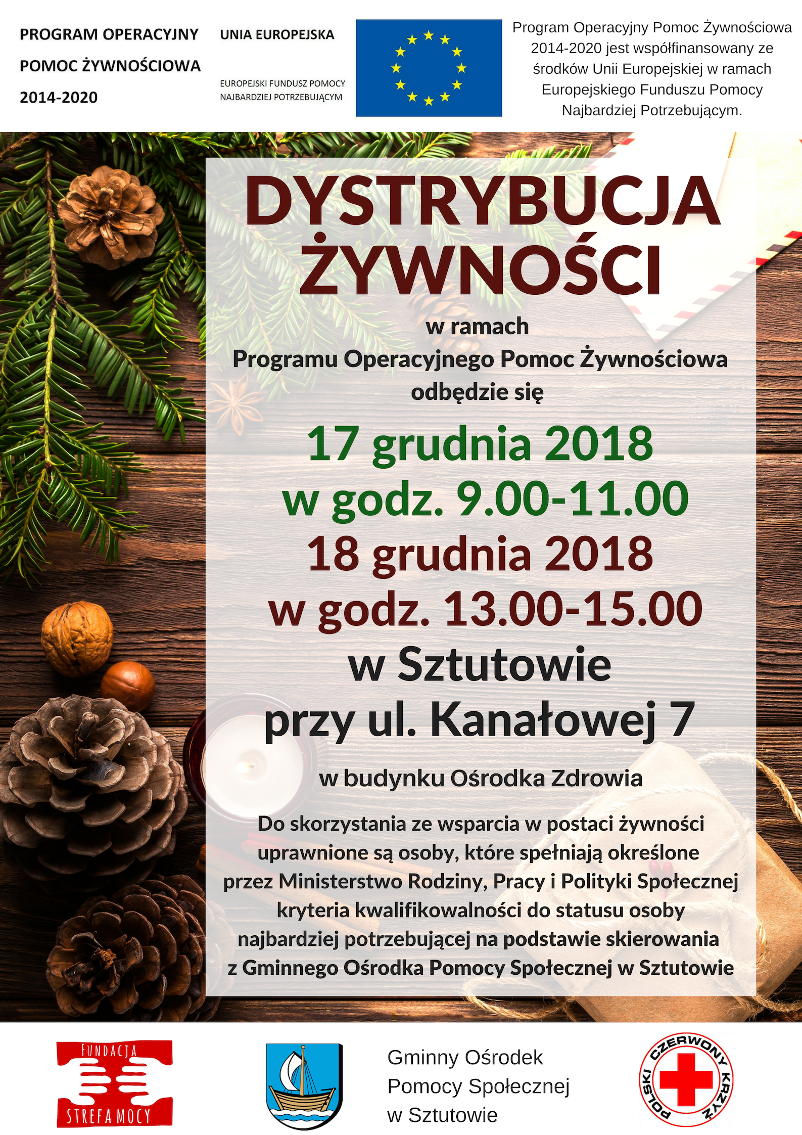 Fundacja Strefa Mocy we współpracy z GOPS i Urzędem Gminy Sztutowo zaprasza osoby najbardziej potrzebujące do odbioru żywności w ramach programu POPŻ.