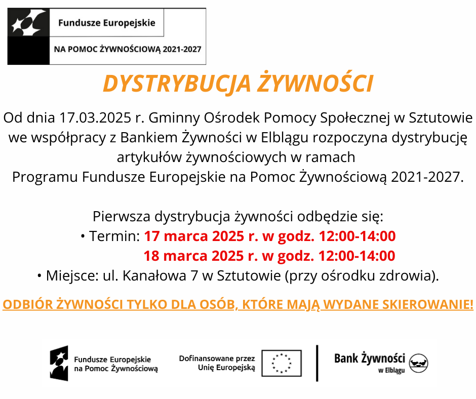 Od dnia 17.03.2025 r. Gminny Ośrodek Pomocy Społecznej w Sztutowie we współpracy z Bankiem Żywności w Elblągu rozpoczyna dystrybucję artykułów żywnościowych w ramach Programu Fundusze Europejskie na Pomoc Żywnościową 2021-2027.