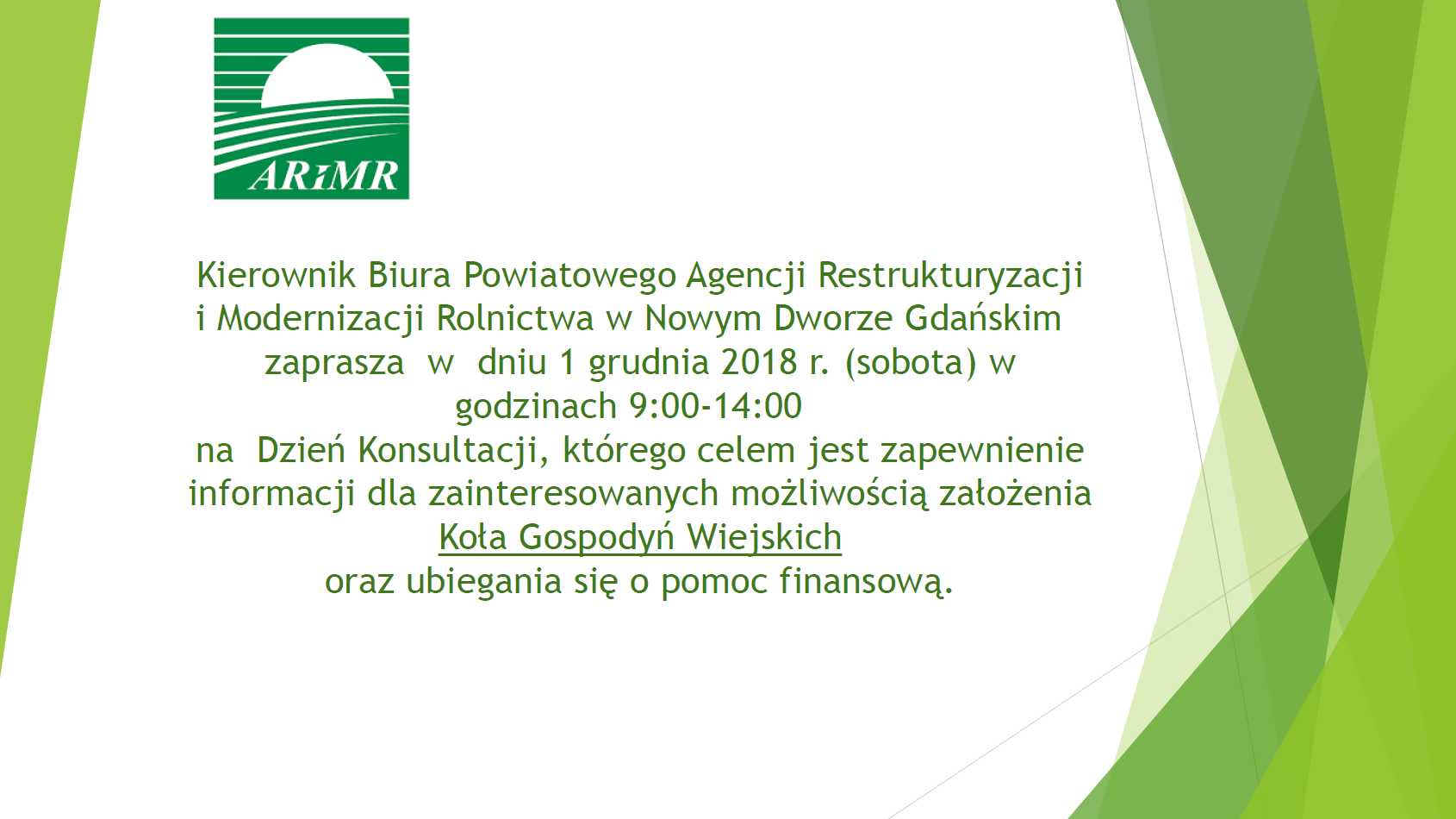 Strona główna » Aktualności » Dzień Konsultacji w Nowym Dworze Gdańskim – 01.12.2018 r. Data dodania 29.11.2018 Dzień Konsultacji w Nowym Dworze Gdańskim – 01.12.2018 r. Agencja Restrukturyzacji i Modernizacji Rolnictwa zaprasza na Dzień Konsultacji organizowany w biurze powiatowym ARiMR w Nowym Dworze Gdańskim w dniu 01.12.2018 r. Drukuj