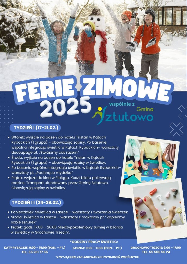 Od 17 do 28 lutego czas na zimową przerwę! To doskonały moment na odpoczynek, zabawę i zimowe przygody! Zachęcamy do zapoznana się z harmonogramem w naszej gminie.
