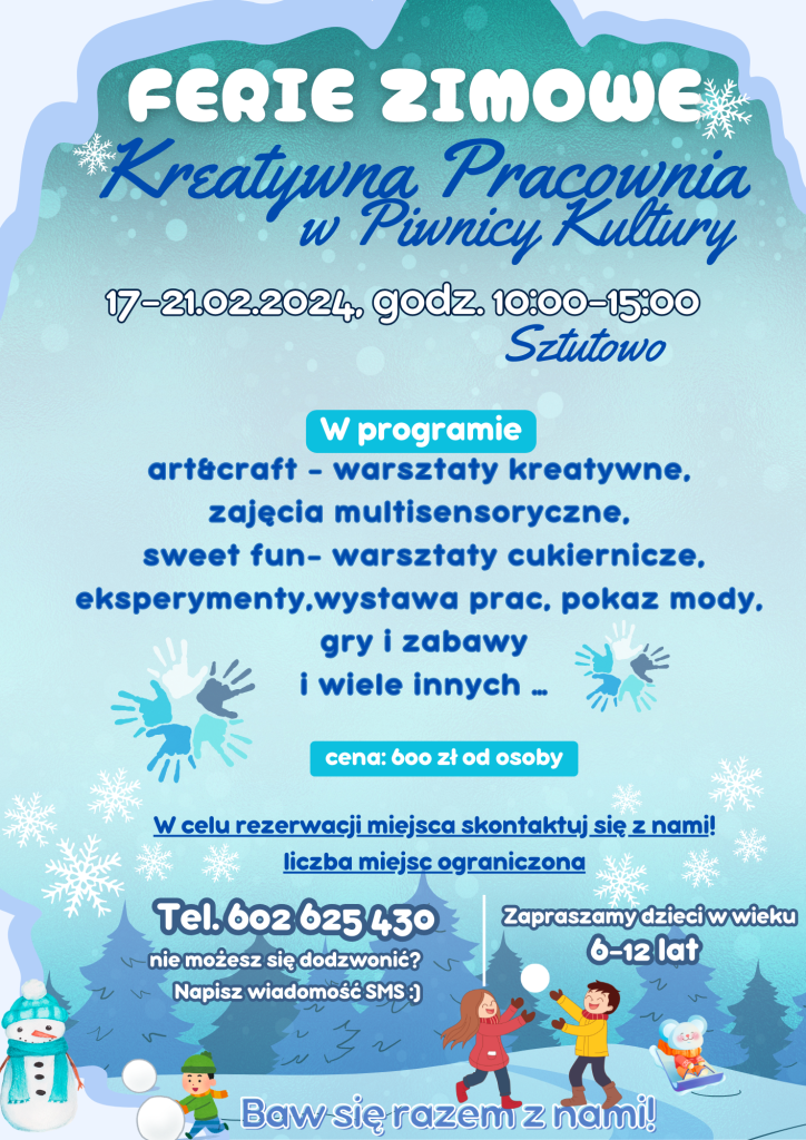 Druga propozycja programu feryjnego to „Kreatywna Pracownia” w Gminnej Piwnicy Kultury w Sztutowie.