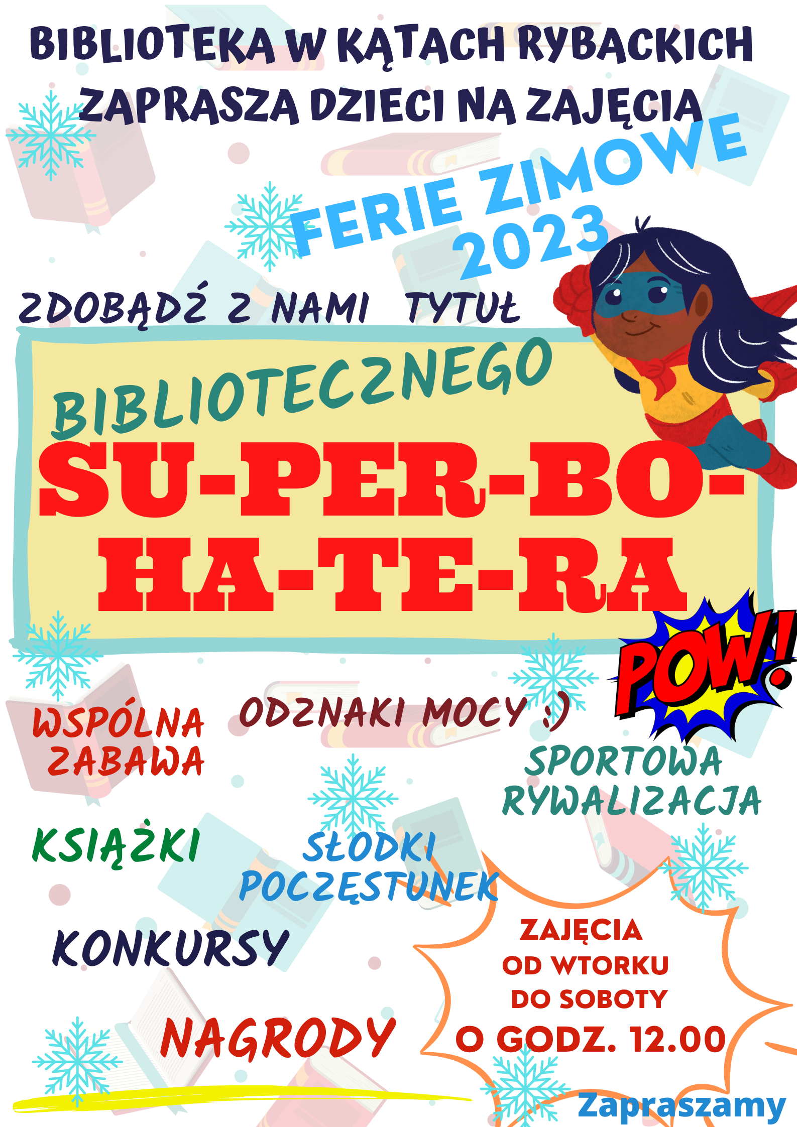 Strona główna » Aktualności » FERIE ZIMOWE w Bibliotece w Kątach Rybackich Data dodania 11.01.2023 FERIE ZIMOWE w Bibliotece w Kątach Rybackich Kto zostanie SUPERBOHATEREM??? Zajęcia od wtorku do soboty o godz. 12:00 Zapraszamy serdecznie Drukuj