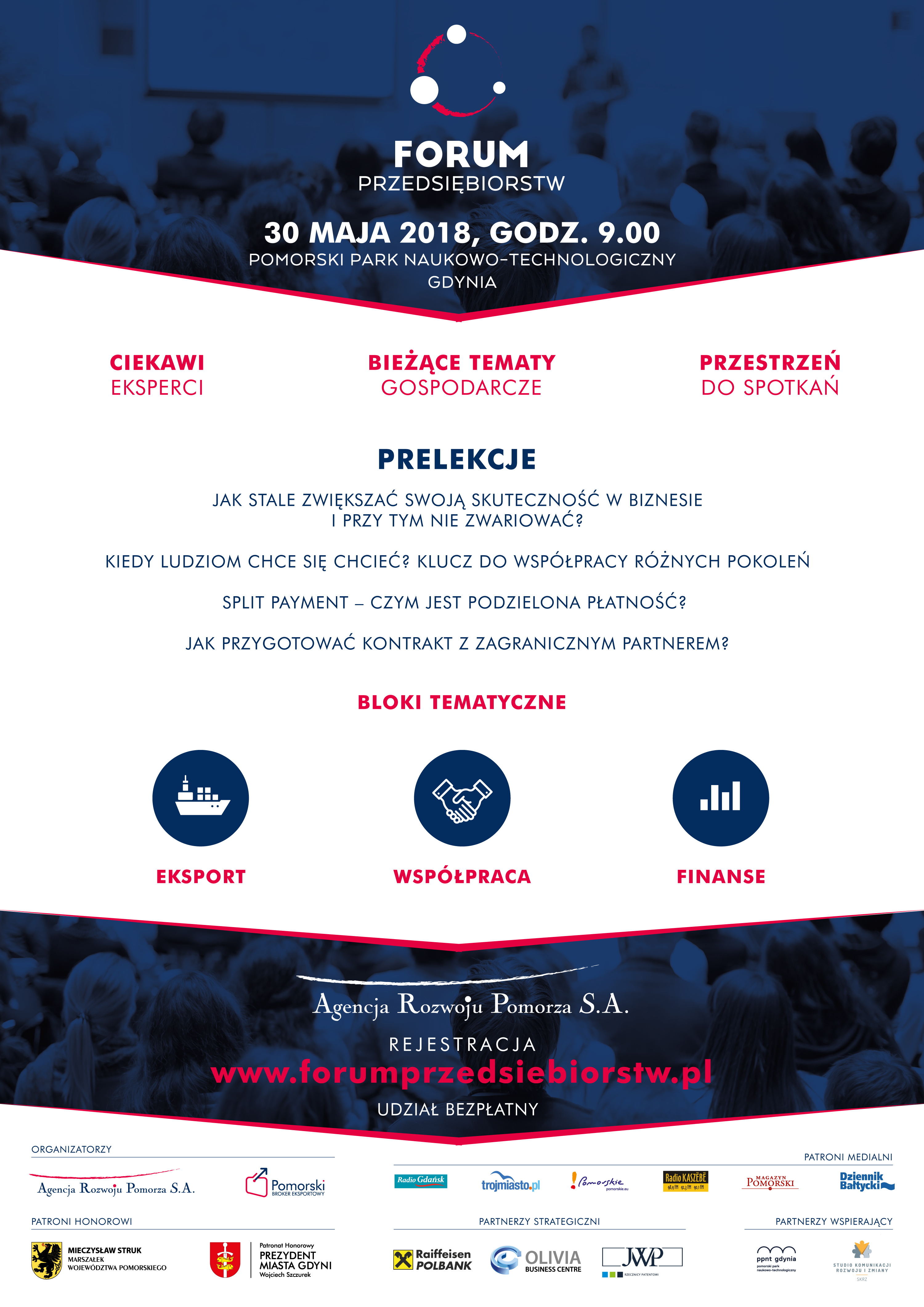 Agencja Rozwoju Pomorza S.A. zaprasza do udziału w kolejnej bezpłatnej edycji FORUM PRZEDSIĘBIORSTW 2018r, które odbędzie się 30 maja 2018 roku o godzinie 9:00 w Pomorskim Parku Naukowo-Technlogicznym w Gdyni. Na forum będą poruszane tematy eksportu, finansów oraz współpracy w biznesie. Jest ono dedykowane mikro, małym i średnim firmom. Szczegóły na plakacie: