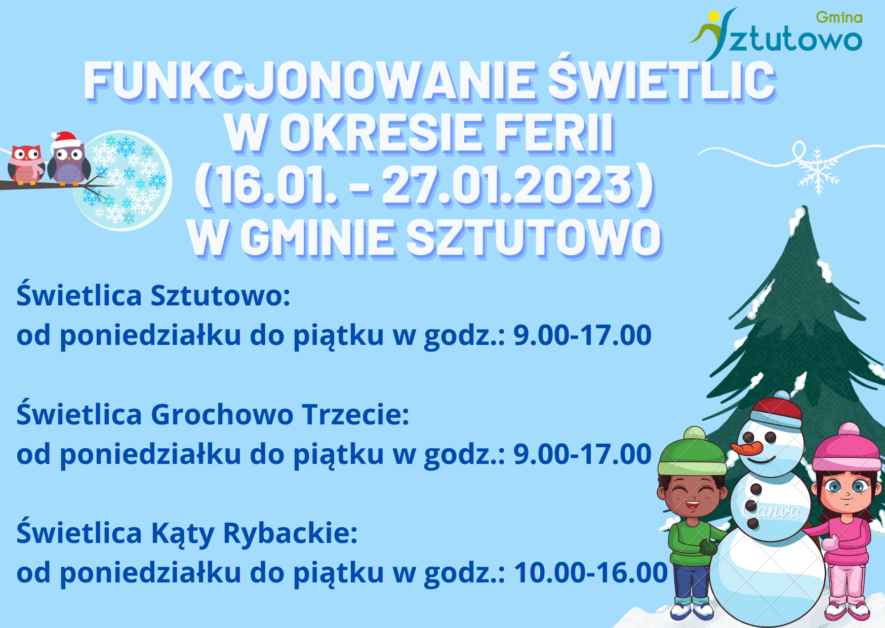 Strona główna » Aktualności » Funkcjonowanie świetlic w Gminie Sztutowo w okresie ferii zimowych Data dodania 10.01.2023 Funkcjonowanie świetlic w Gminie Sztutowo w okresie ferii zimowych Drukuj