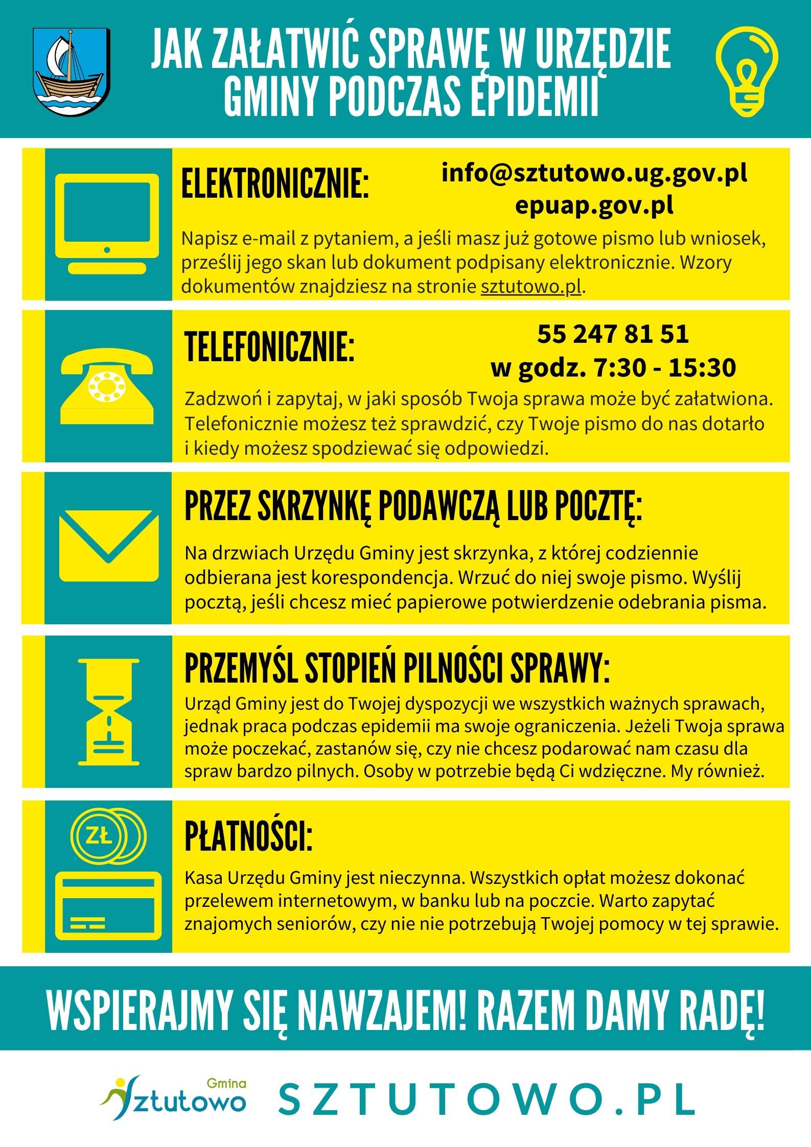 Przypominamy, że Urząd Gminy w Sztutowie cały czas jest dostępny dla mieszkańców we wszystkich sprawach. Dla wszystkich, którzy nie mają możliwości załatwienia sprawy elektronicznie, przygotowane jest wejście boczne do urzędu „na dzwonek”. Prosimy jednak w miarę możliwości o wcześniejsze umówienie się telefoniczne.