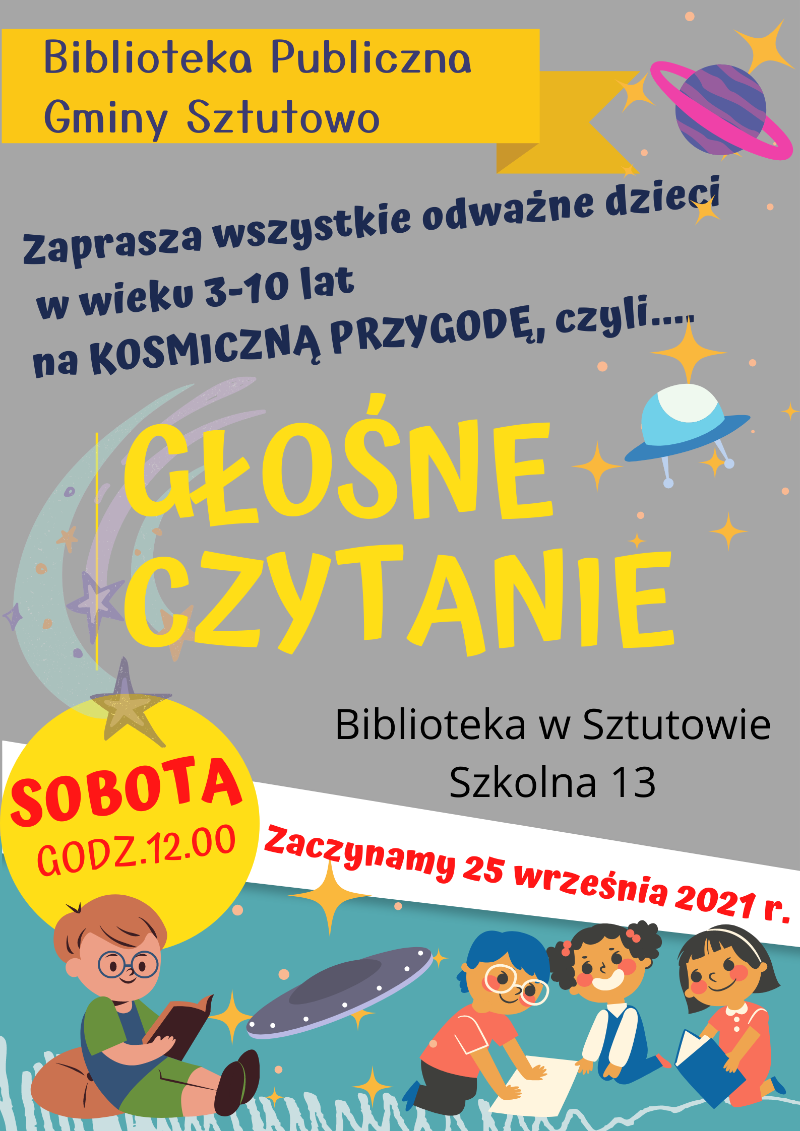 Strona główna » Aktualności » Głośne Czytanie w Bibliotece Data dodania 21.09.2021 Głośne Czytanie w Bibliotece Biblioteka Publiczna Gminy Sztutowo zaprasza wszystkie odważne dzieci na Kosmiczną Przygodę, czyli Głośne Czytanie. Sobota 25 września 2021 r. Biblioteka w Sztutowie, ul. Szkolna 13. Drukuj