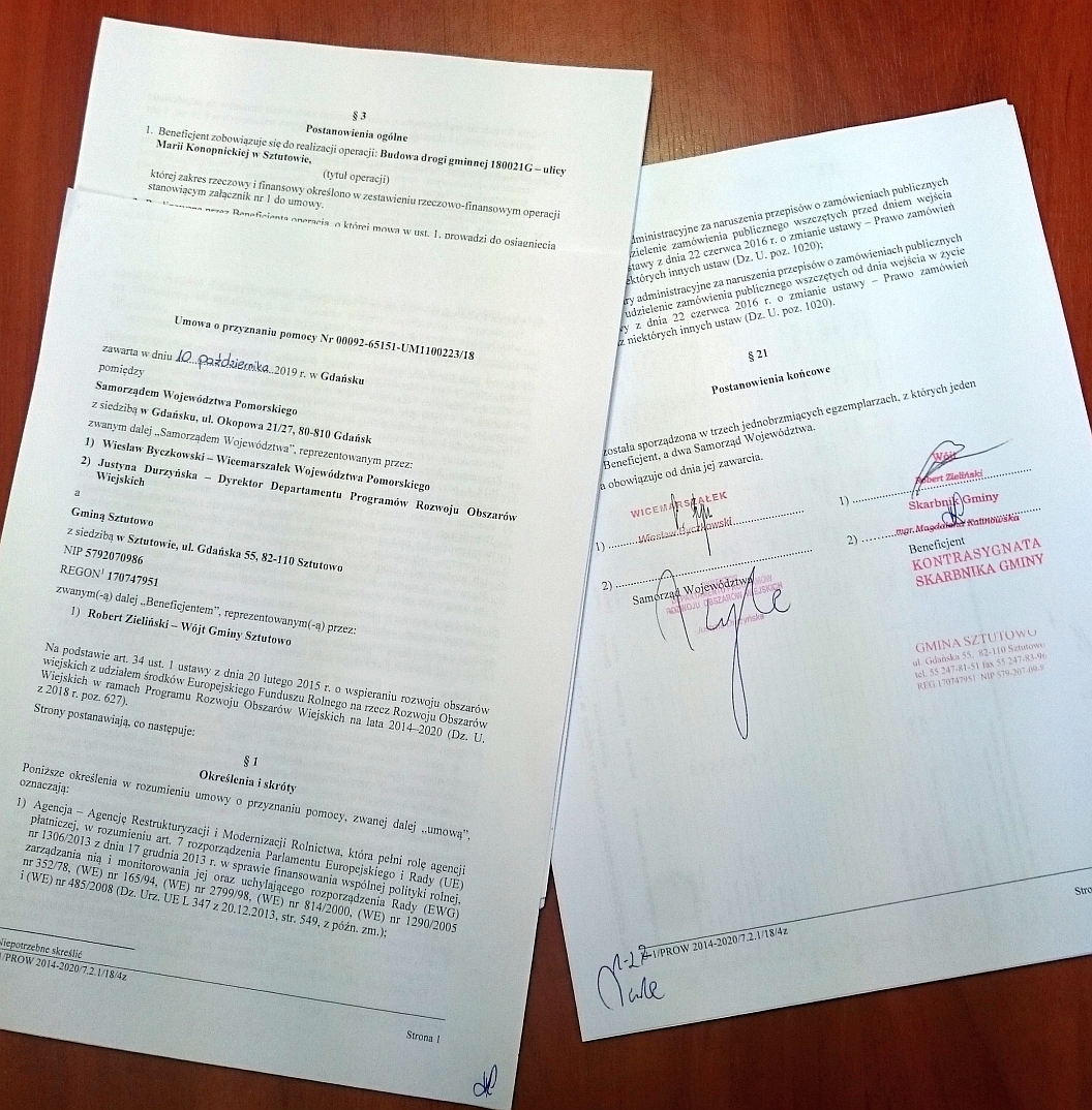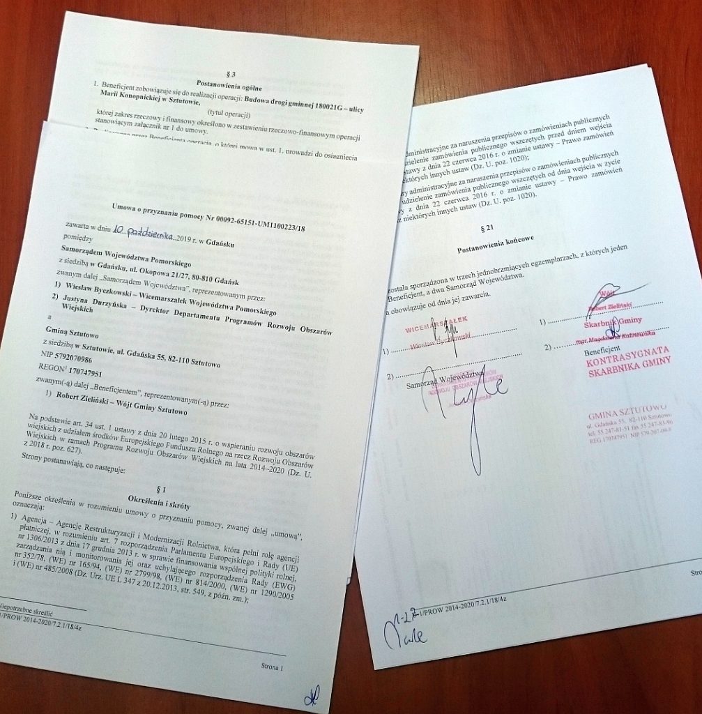 Dziś Wójt Gminy Sztutowo Robert Zieliński podpisał umowę z Samorządem Województwa Pomorskiego na „Budowę drogi gminnej 180021G – ulicy Marii Konopnickiej w Sztutowie”. Kwota dofinansowania tego zadania z Programu Rozwoju Obszarów Wiejskich 2014-2020 wynosi 770 958 zł, tj. do 63,63% kosztów kwalifikowalnych operacji. Czas na realizację – do końca 2021 roku.