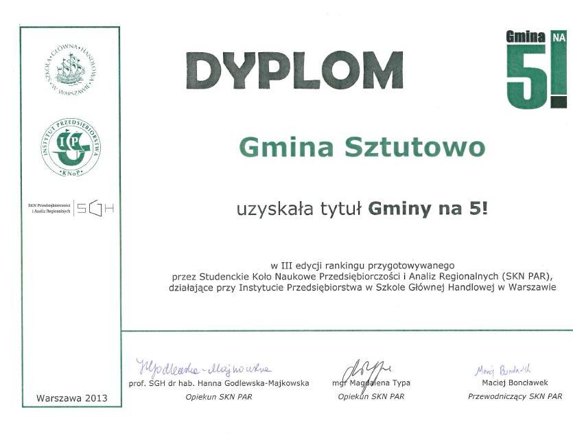 Szkołę Główną Handlową w Warszawie, Gmina Sztutowo uzyskała tytuł Gminy na 5!